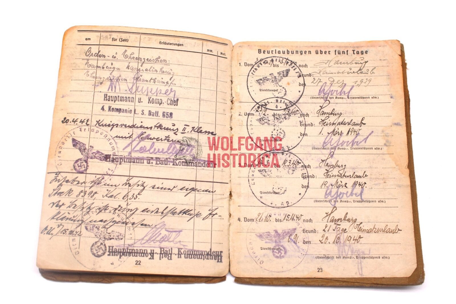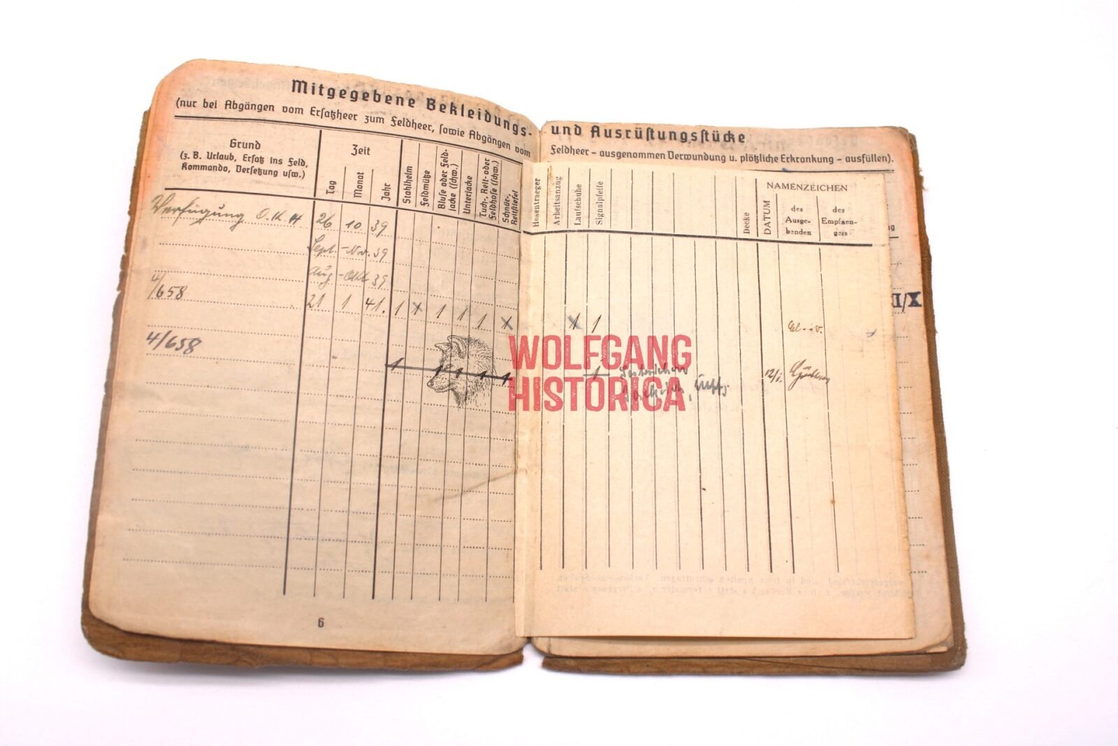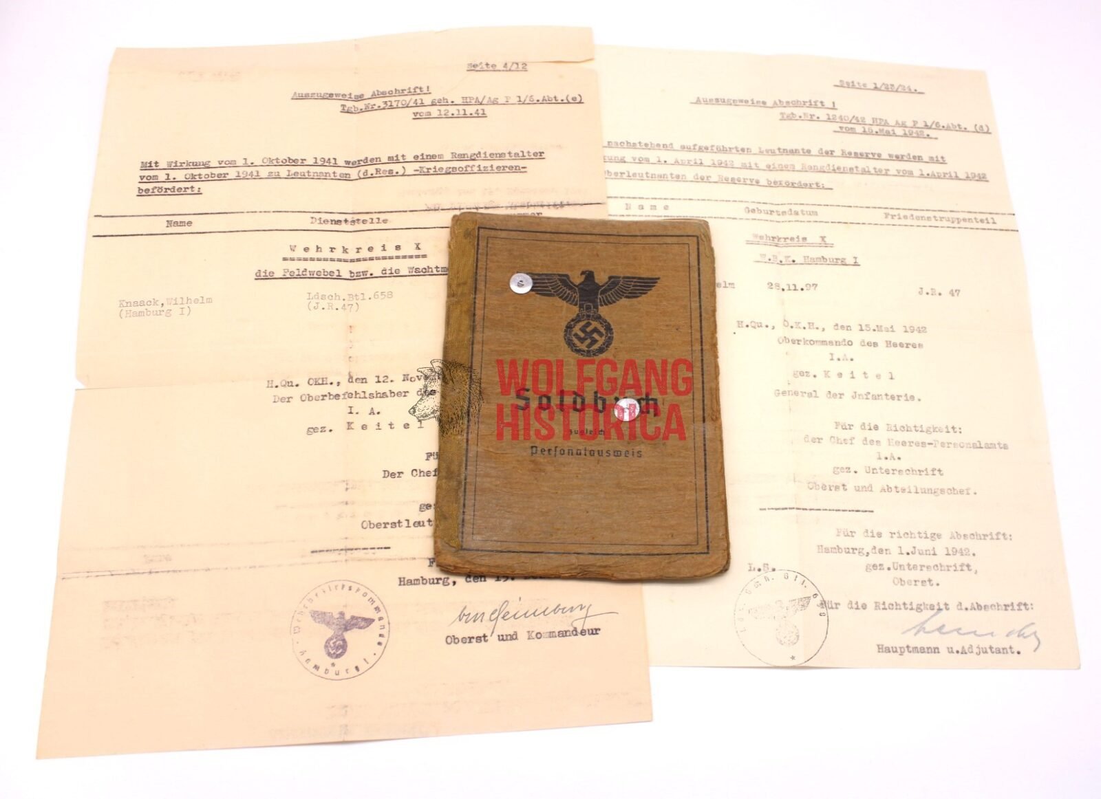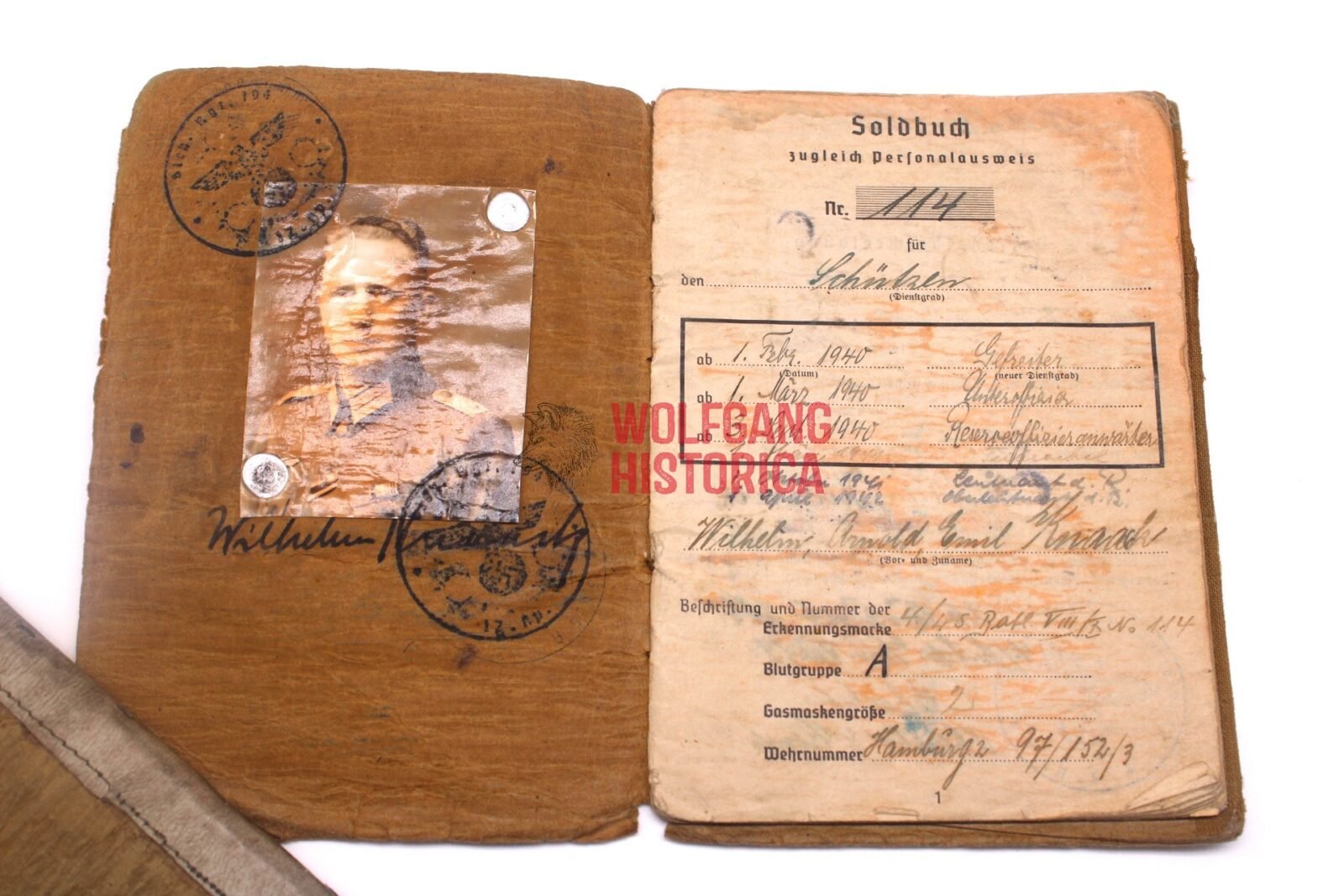 Original Soldbuch of Oberleutnant Wilhelm Knaack, born on November 28, 1897 in Hamburg. The Soldbuch was opened on August 26, 1939. He wore the Erkennungsmarke: -114- 4./W.S. 13. VIII.