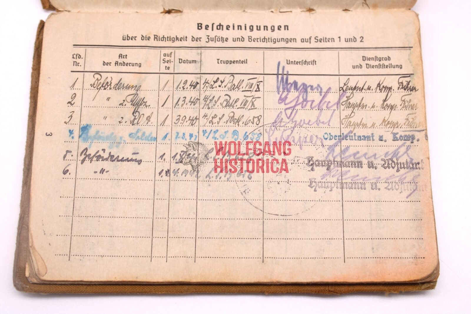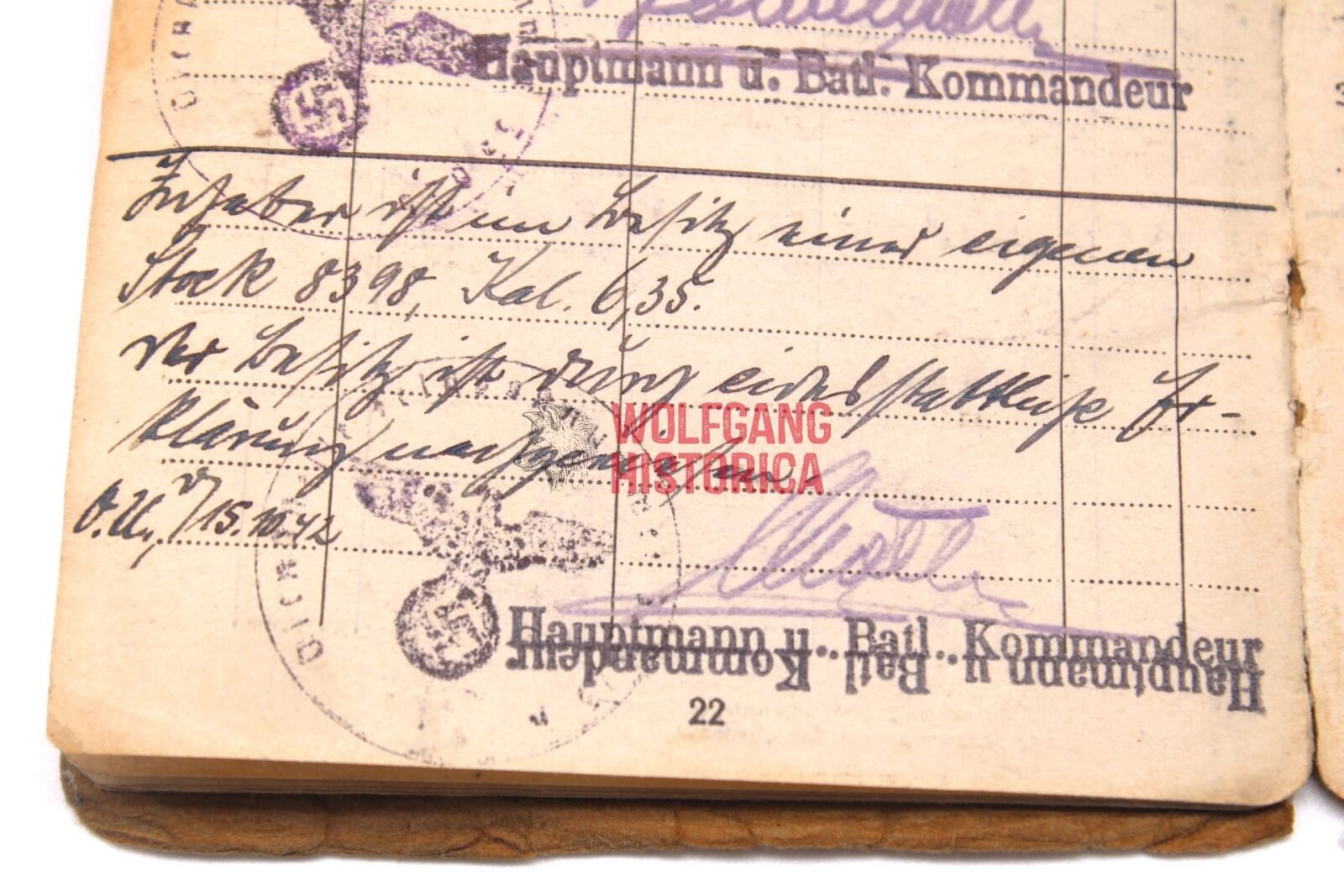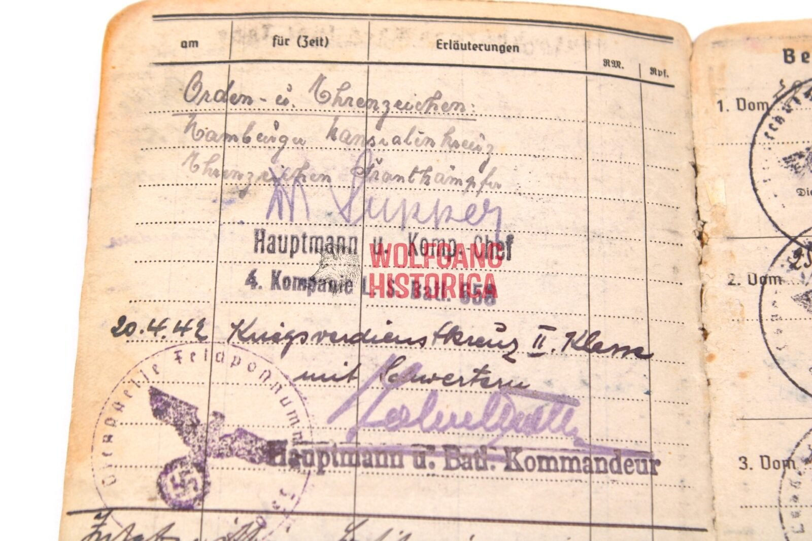 Original Soldbuch of Oberleutnant Wilhelm Knaack, born on November 28, 1897 in Hamburg. The Soldbuch was opened on August 26, 1939. He wore the Erkennungsmarke: -114- 4./W.S. 13. VIII.
