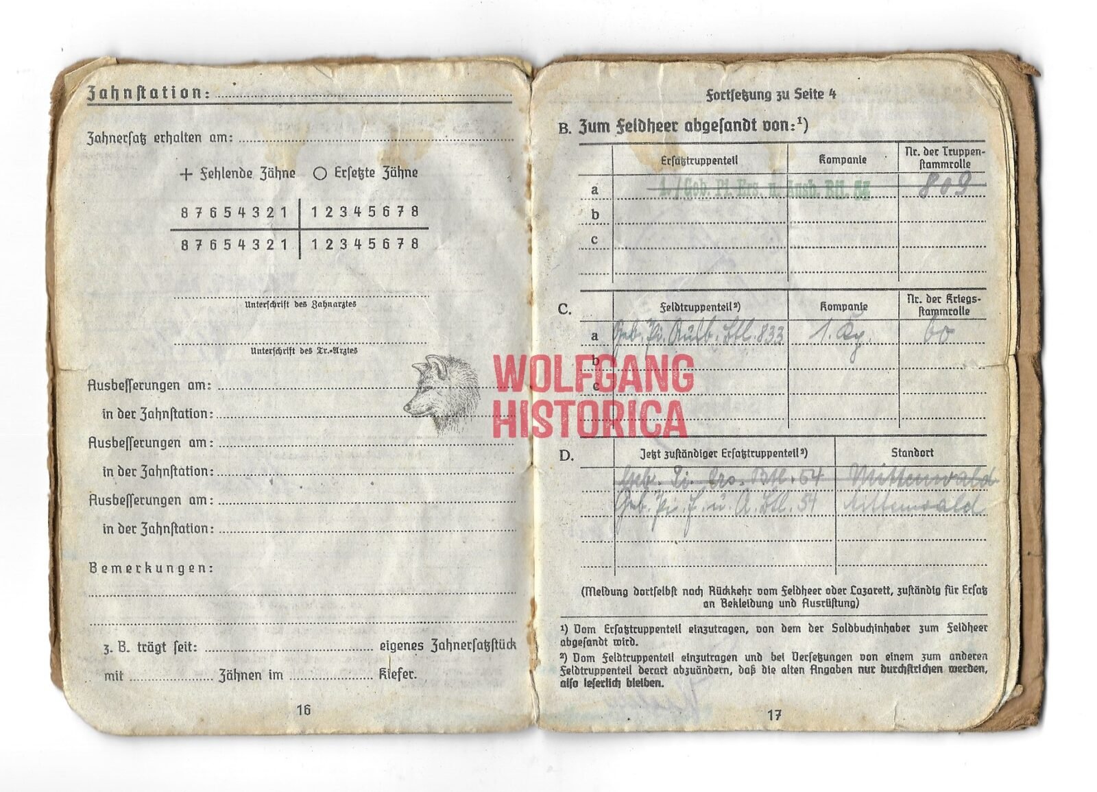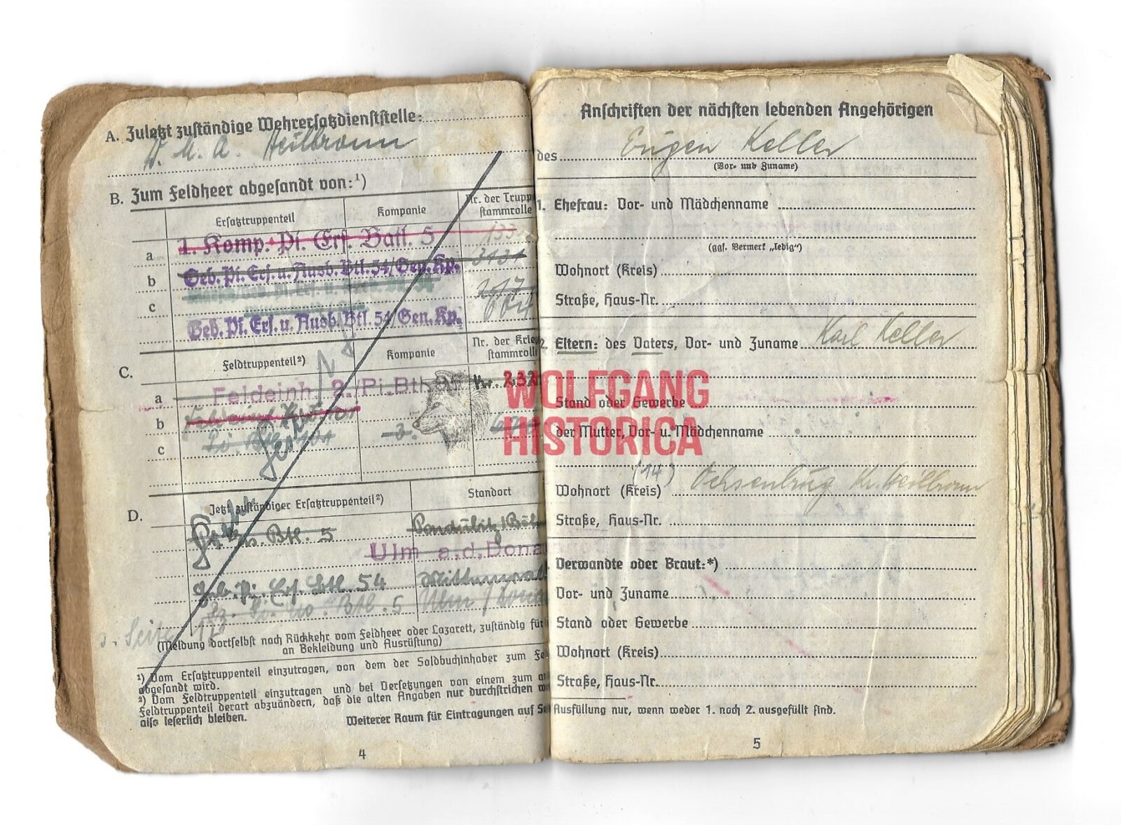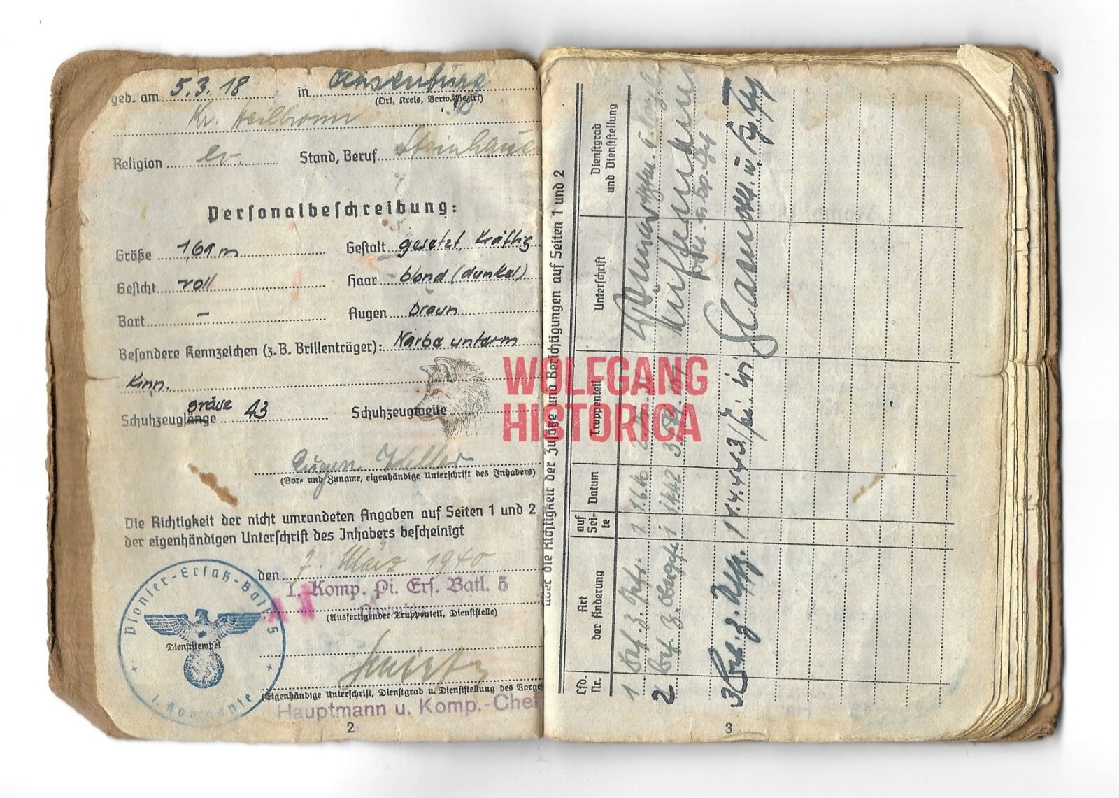 Interesting Soldbuch of a Unteroffizier Eugen Keller, whom served with Pionier-Bataillon 35 & 101 of the 101. Jäger-Division, with which he earned all of his awards. During his service, he earned the Allgemeines-SturmabzeichenEisernes Kreuz 2. Klasse, Winterschlacht im Osten, Verwundetenabzeichen in SchwarzNahkampfspange I. Stufe Kubanschild. Afterwards he served with the Gebirgs-Pionier-Ausbildungs-Bataillon 833. He received a lot of Gebirgsjäger equipment. Good condition. Photo inside!
