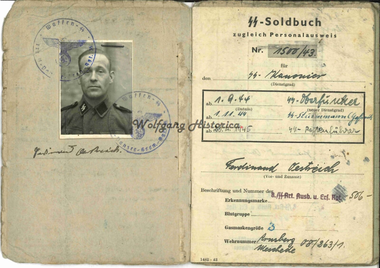 Original Soldbuch of SS-Rottenführer Ferdinand Ostreich, who served with the SS-Panzer-Grenadier-Regiment 36 of the 16. SS–Panzer-Grenadier-Division “Reichsführer-SS“ & SS-Panzer-Grenadier-Regiment 6 “Theodor Eicke” & Nachrichten-Kompanie of the 3. SS-Panzer-Division “Totenkopf”. Interestingly, he was promoted after he went Missing. Although, he’s listed in the DRK books, he died in Russian captivity in March 1945 (or was last seen alive on this date and died later, sometimes these dates of death were used when last seen alive if they didn’t have a correct date of death). This was confirmed by WASt that he died in captivity. Complete with a photo.
