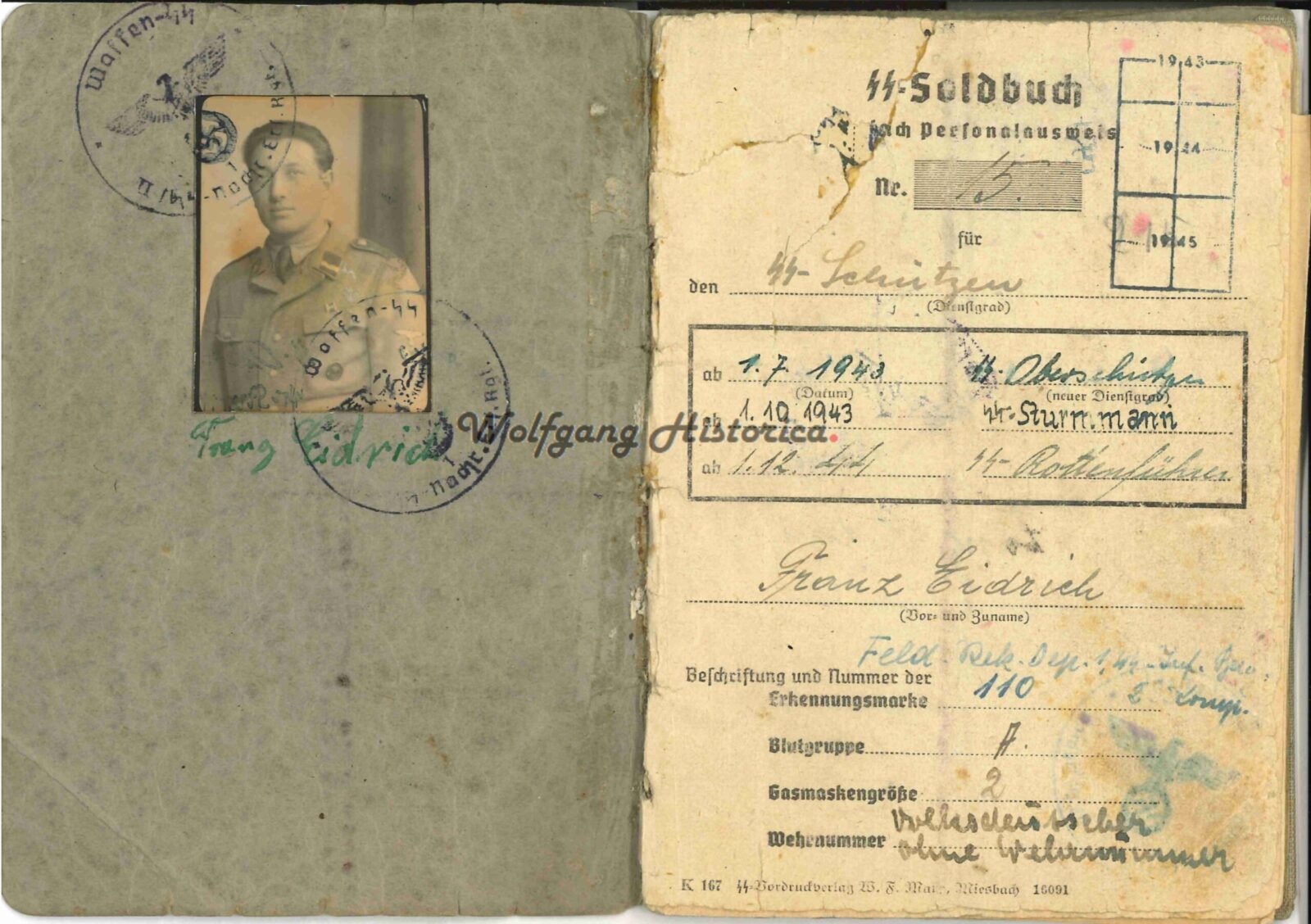 Original Soldbuch of SS-Rottenführer Franz Eidrich, who served with the SS-Infanterie-Brigade, SS-Infanterie-Regiment 8, Kommandeur Divisions-Nachrichten-Truppen 17 and SS-Nachrichten-Abteilung 17 of the 17. SS-Panzergrenadier-Division “Götz von Berlichingen”. Complete with a photo, wearing his VWA! He earned the Verwundetenabzeichen in Schwarz on October 1, 1943 and the Kriegsverdienstkreuz 2. Klasse mit Schwertern on December 15, 1944. He likely took part in most actions against the US Forces since 1944 until April of 45!