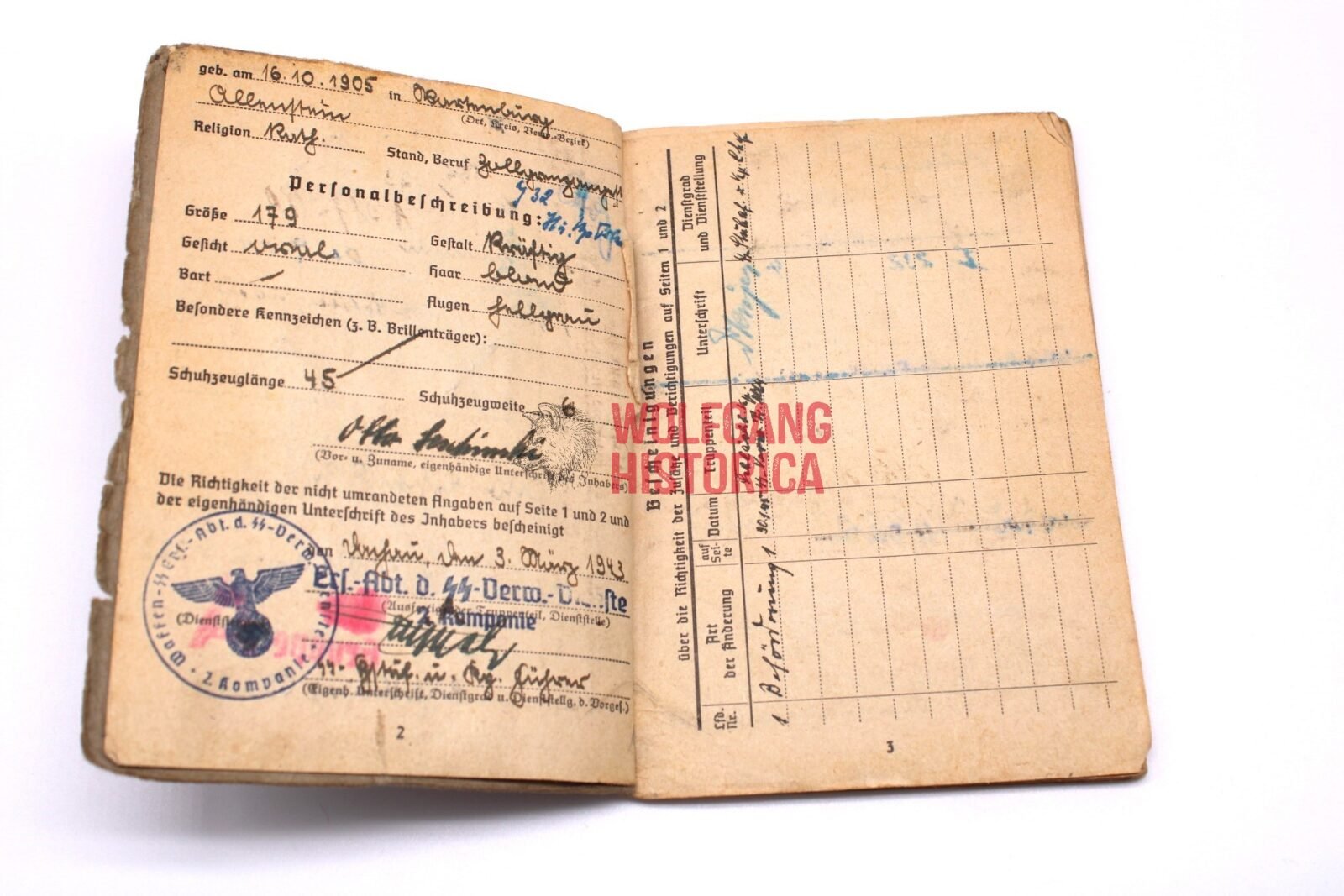 Original SS-Soldbuch of SS-Rottenführer Otto Geschinki (?), born on October 16, 1905 in Allenstein. Soldbuch opened on March 3, 1943 by the Ersatz-Abteilung der SS-Verwaltungs-Dienste. Erkennungsmarke: -353- 2./Ers.Abt.d.SS.V-D.