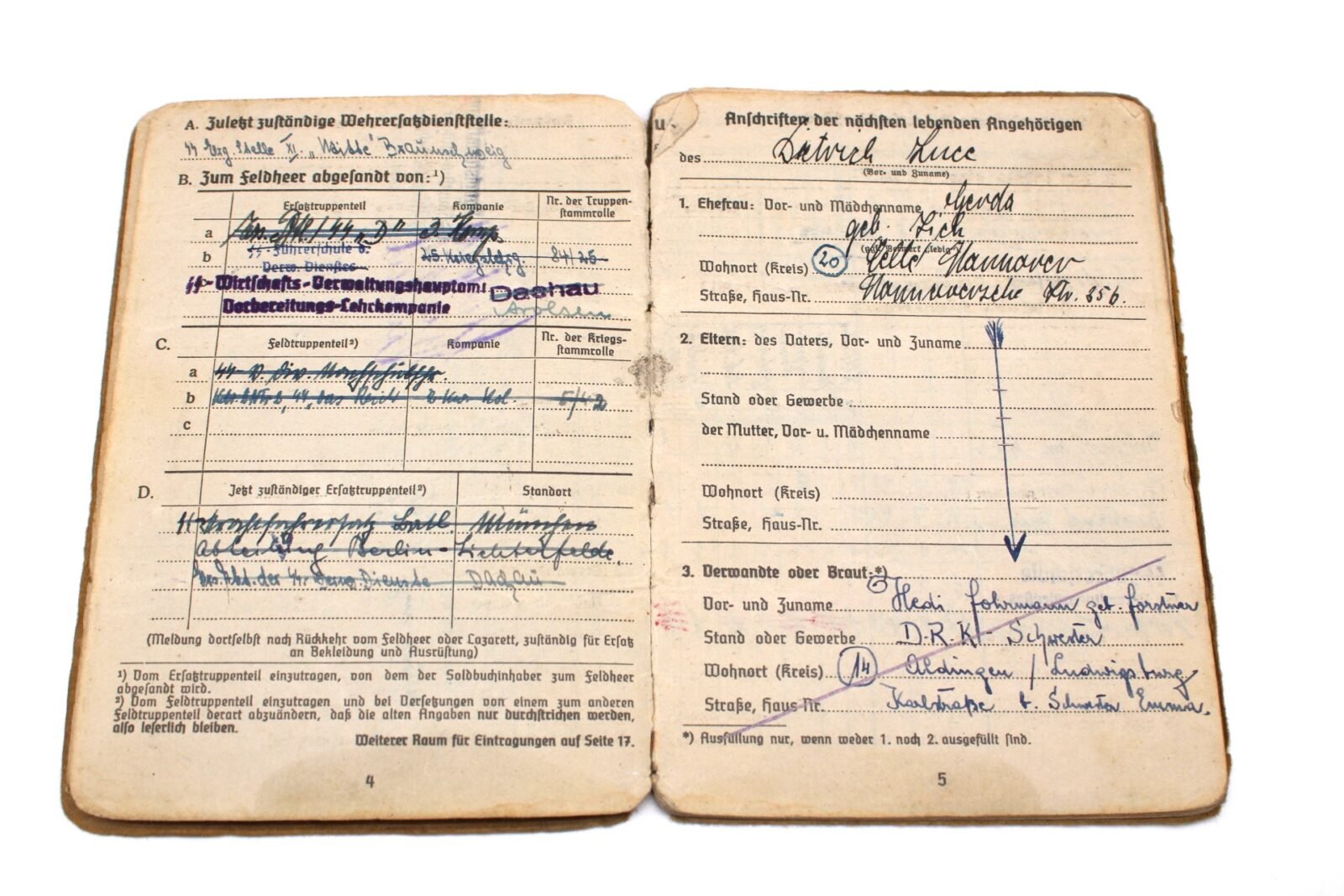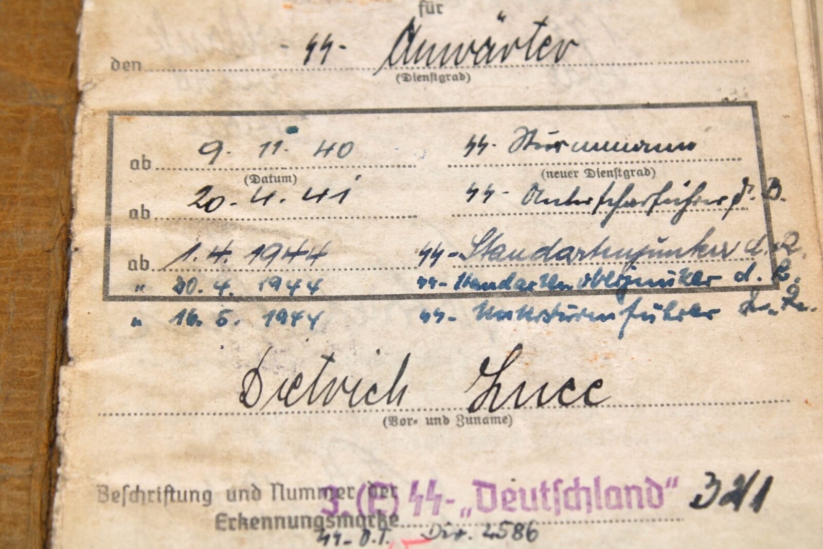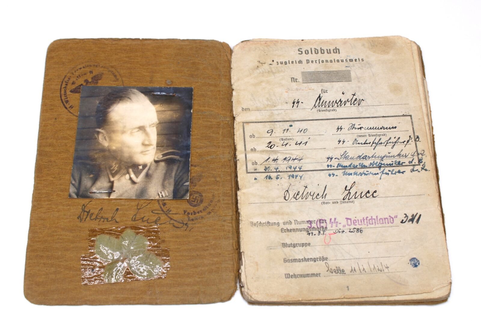 Original Waffen-SS Soldbuch & Internierten-Ausweis of SS-Untersturmführer Dietrich Luce. SS-Ustuf. Luce served with the Ersatzbataillon SS-“Deutschland” of the SS-Verfügungstruppe, SS-Divisions-Nachschub-Truppen & SS-Kommandeur-Divisions-Nachschub-Truppen “Das Reich”, SS-Führschule der Verwaltungsdienstes, SS-Wirtschafts-Verwaltungshauptamt (Vorbereitungs-Lehrkompanie) in Dachau & the XIII. SS-Armeekorps (according to the Führerliste). Very interestingly is the SS-Skanderberg stamp in the Soldbuch!. During his career, he earned the Kriegsverdienstkreuz 2. Klasse mit Schwertern, Winterschlacht im Osten 1941/42 and Kriegsverdienstkreuz 1. Klasse mit Schwertern (1945!). On the front the Swastika is visible but there has been attempts made to censor it. Swastikas in the Soldbuch were censored. Complete with photo but lose pages.