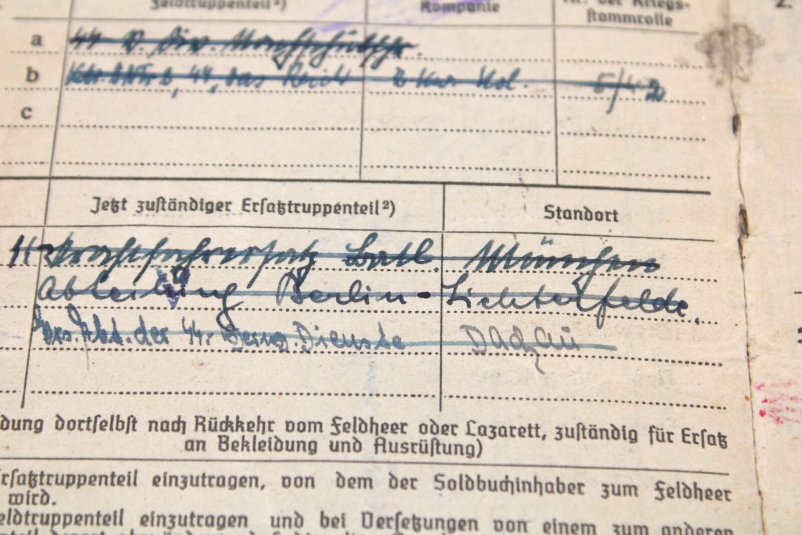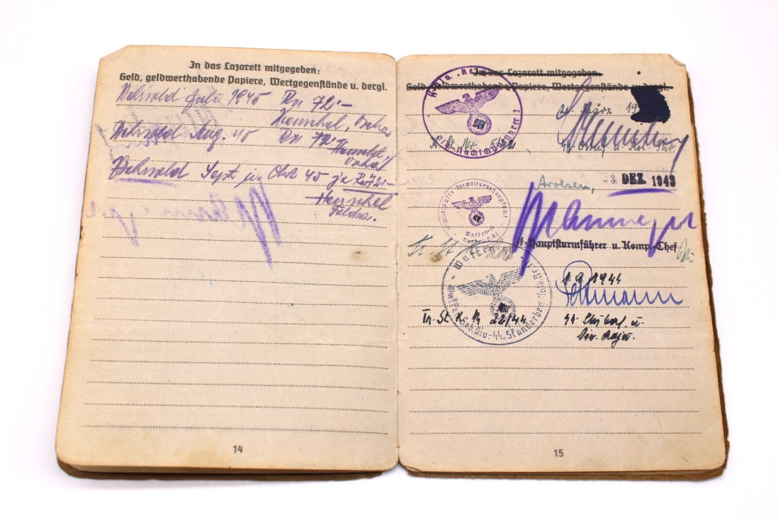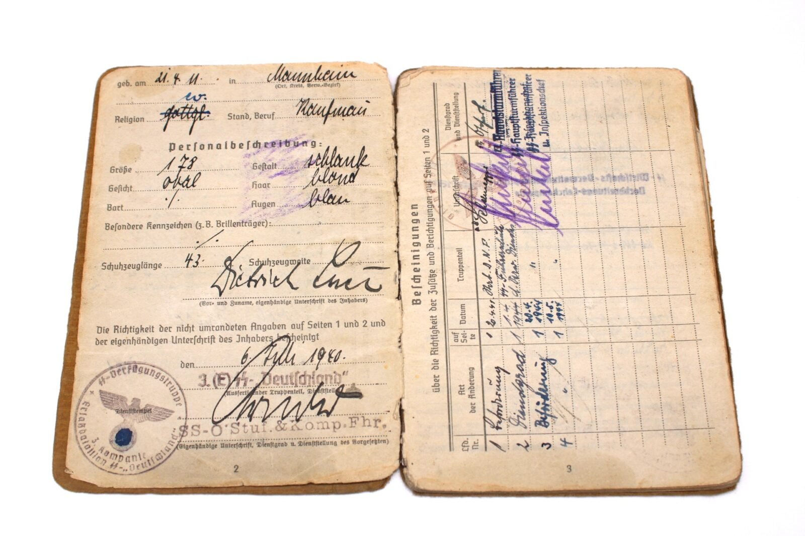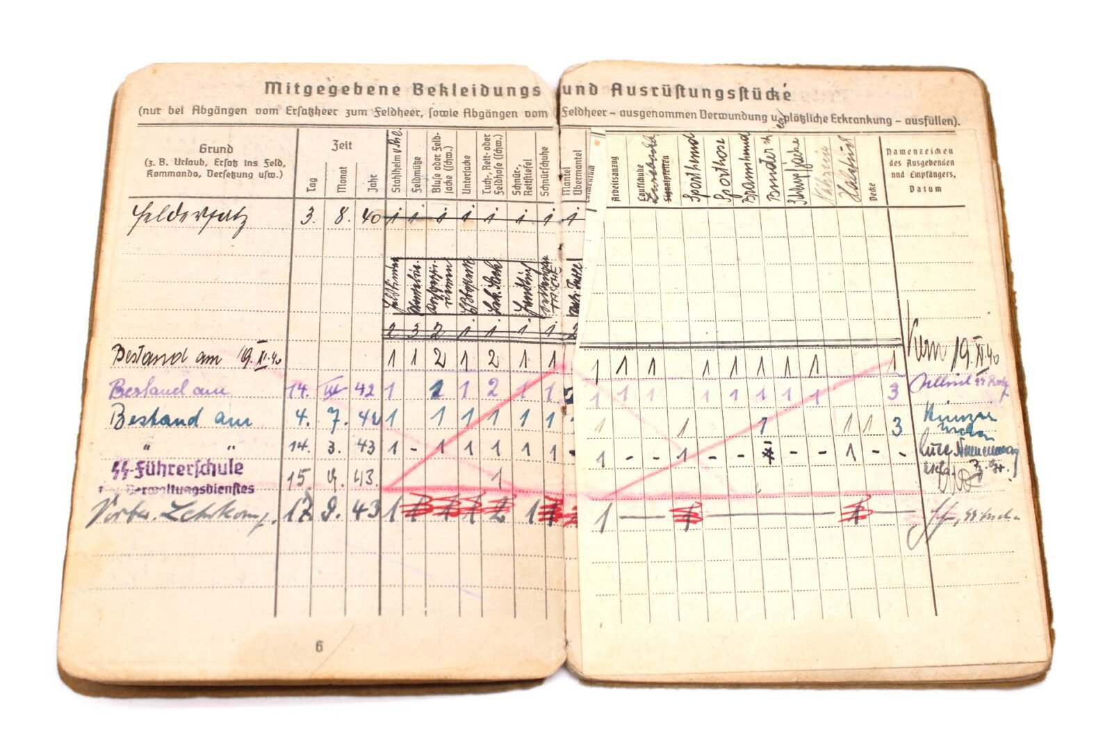 Original Waffen-SS Soldbuch & Internierten-Ausweis of SS-Untersturmführer Dietrich Luce. SS-Ustuf. Luce served with the Ersatzbataillon SS-“Deutschland” of the SS-Verfügungstruppe, SS-Divisions-Nachschub-Truppen & SS-Kommandeur-Divisions-Nachschub-Truppen “Das Reich”, SS-Führschule der Verwaltungsdienstes, SS-Wirtschafts-Verwaltungshauptamt (Vorbereitungs-Lehrkompanie) in Dachau & the XIII. SS-Armeekorps (according to the Führerliste). Very interestingly is the SS-Skanderberg stamp in the Soldbuch!. During his career, he earned the Kriegsverdienstkreuz 2. Klasse mit Schwertern, Winterschlacht im Osten 1941/42 and Kriegsverdienstkreuz 1. Klasse mit Schwertern (1945!). On the front the Swastika is visible but there has been attempts made to censor it. Swastikas in the Soldbuch were censored. Complete with photo but lose pages.
