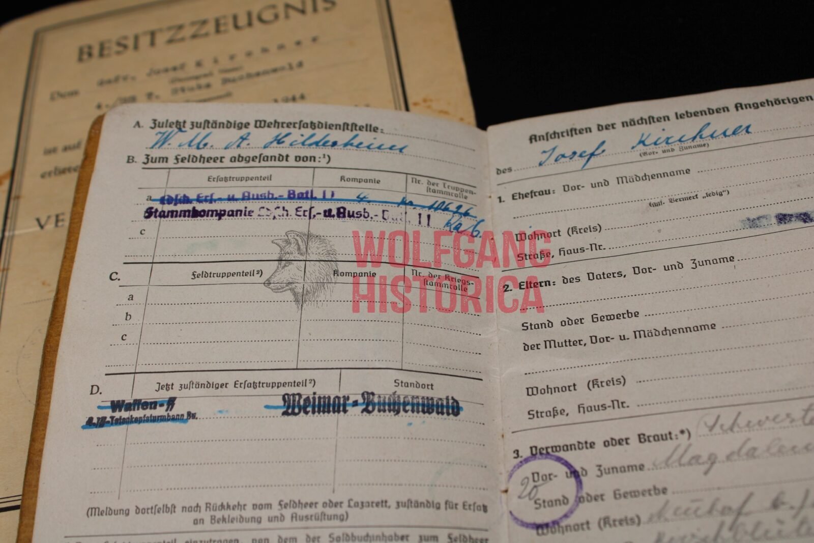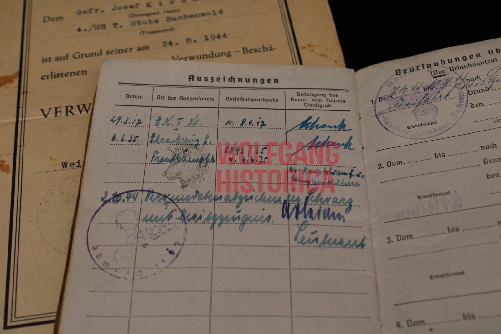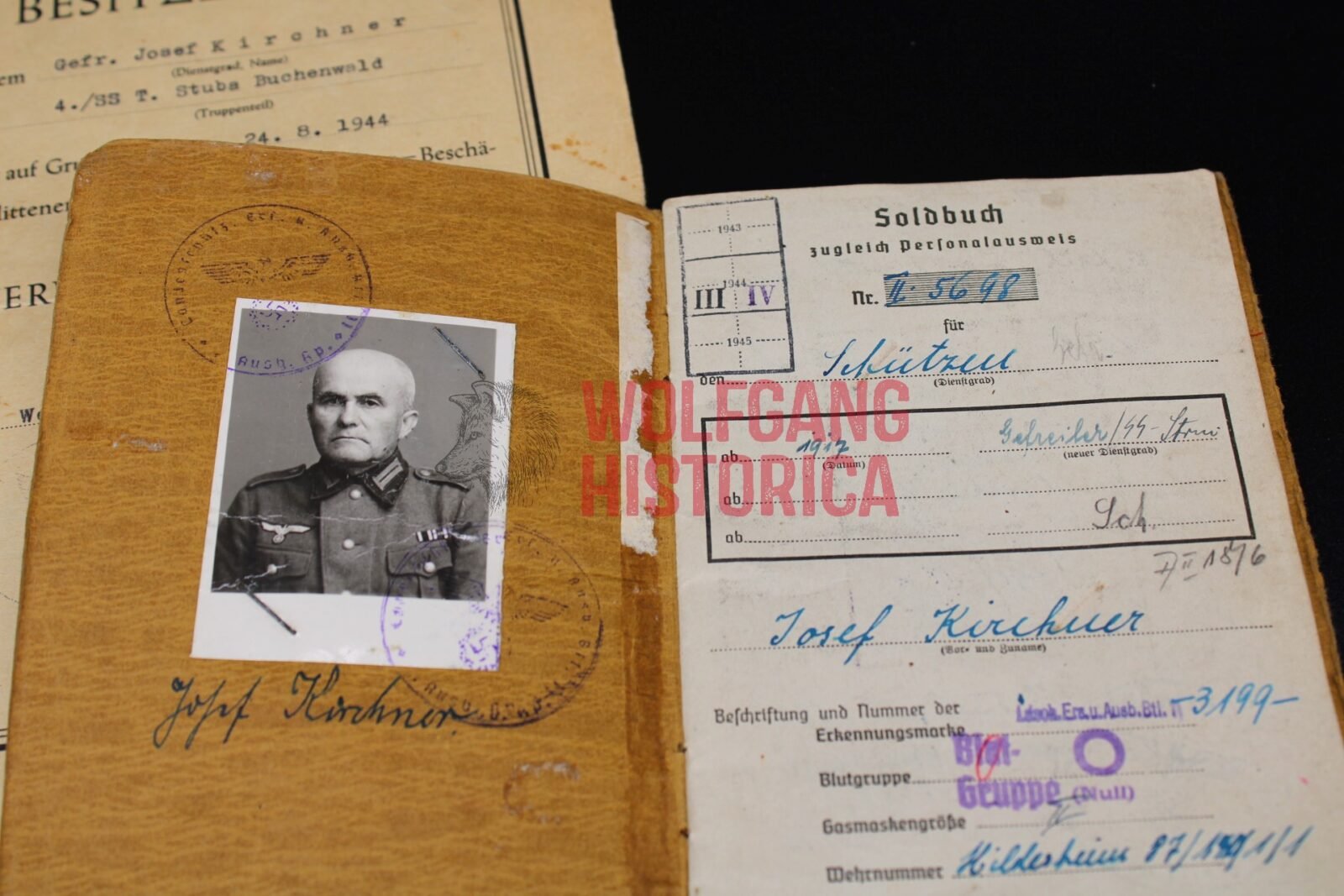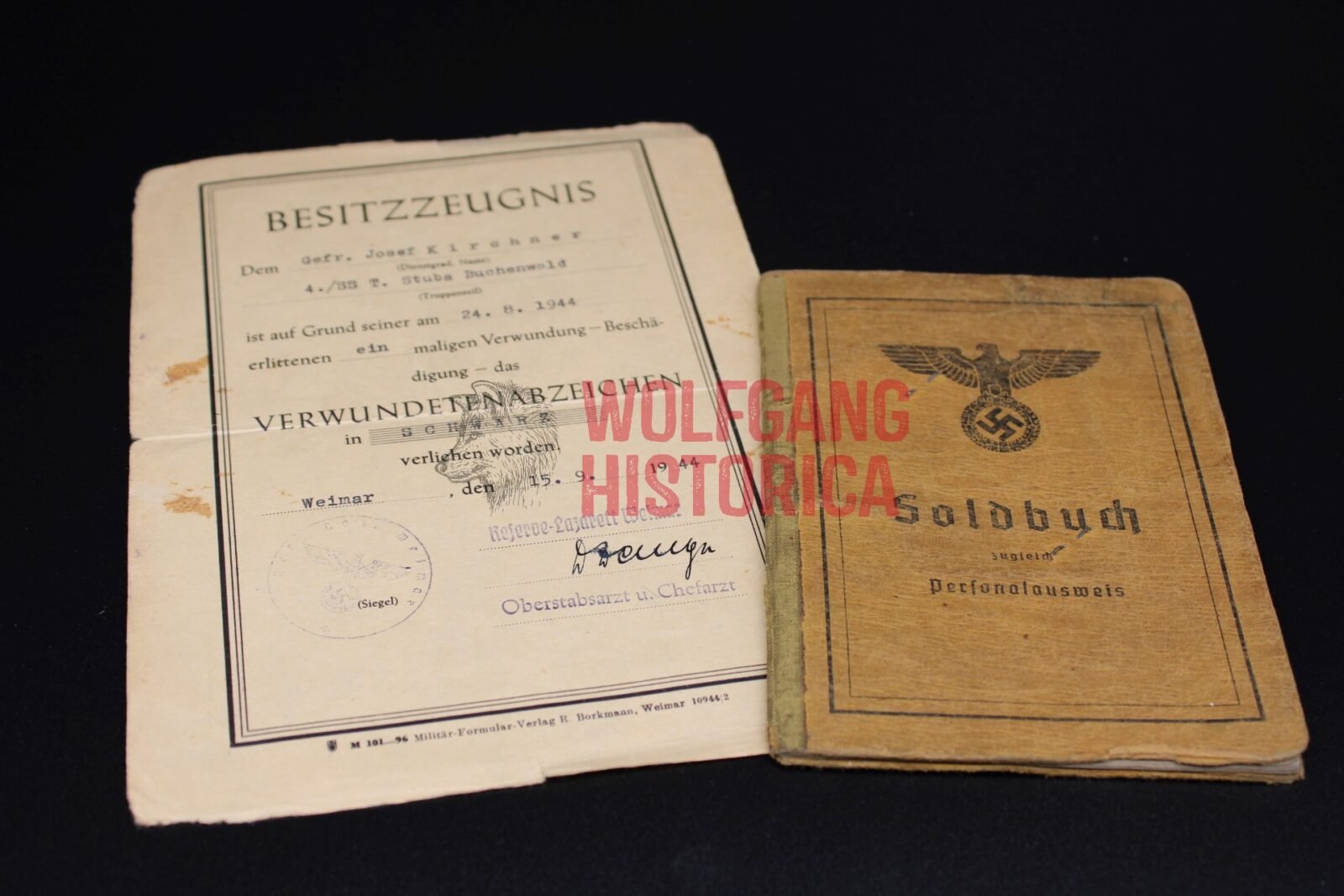 Soldbuch and Award document for a SS-Sturmmann / Gefreiter Josef Kirchner. The Soldbuch is complete and has a ID photo in it. He most likely (according to info in the Soldbuch) was transferred from a reserve Wehrmacht training unit to the SS-Totenkopf-Sturmbann “Buchenwald”. Several stamps of Buchenwald as well as signatures from SS-Hauptsturmführer Schenk (not much known, in one of the books you’ll read he’s mentioned as leader of the Musikkorps) and SS-Obersturmführer Bruno Dembeck. Dembeck was notorious for torturing and killing inmates in Sachsenhausen, Dachau and Buchenwald. He died in December 1944, only two months after signing Kirchner’s leave entry. This comes with Kirchner’s award document for the Verwundetenabzeichen in Schwarz, which he was awarded for his wound(s) suffered on August 24, 1944 when the KZ Buchenwald was bombed!