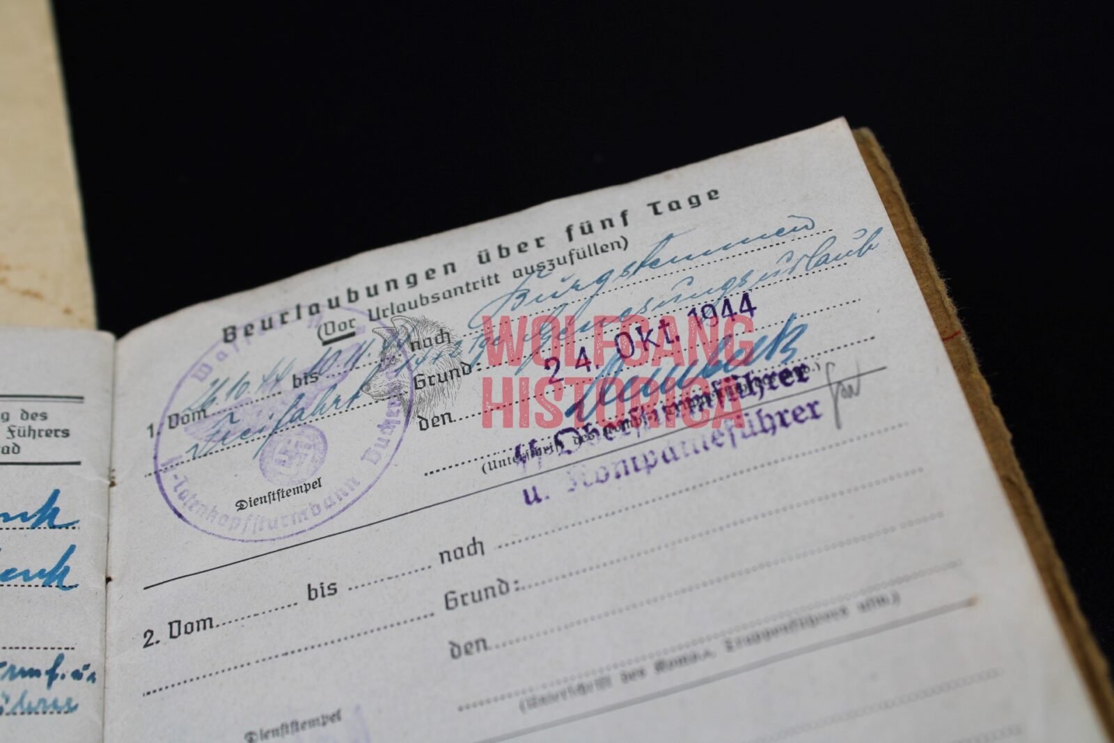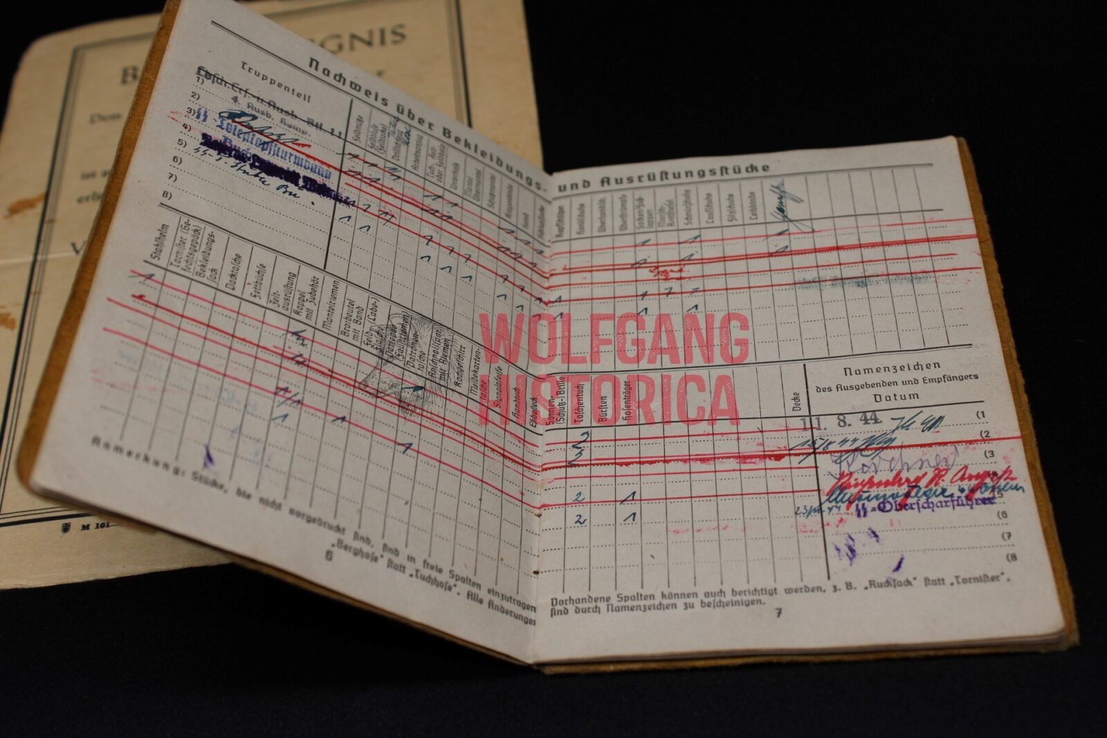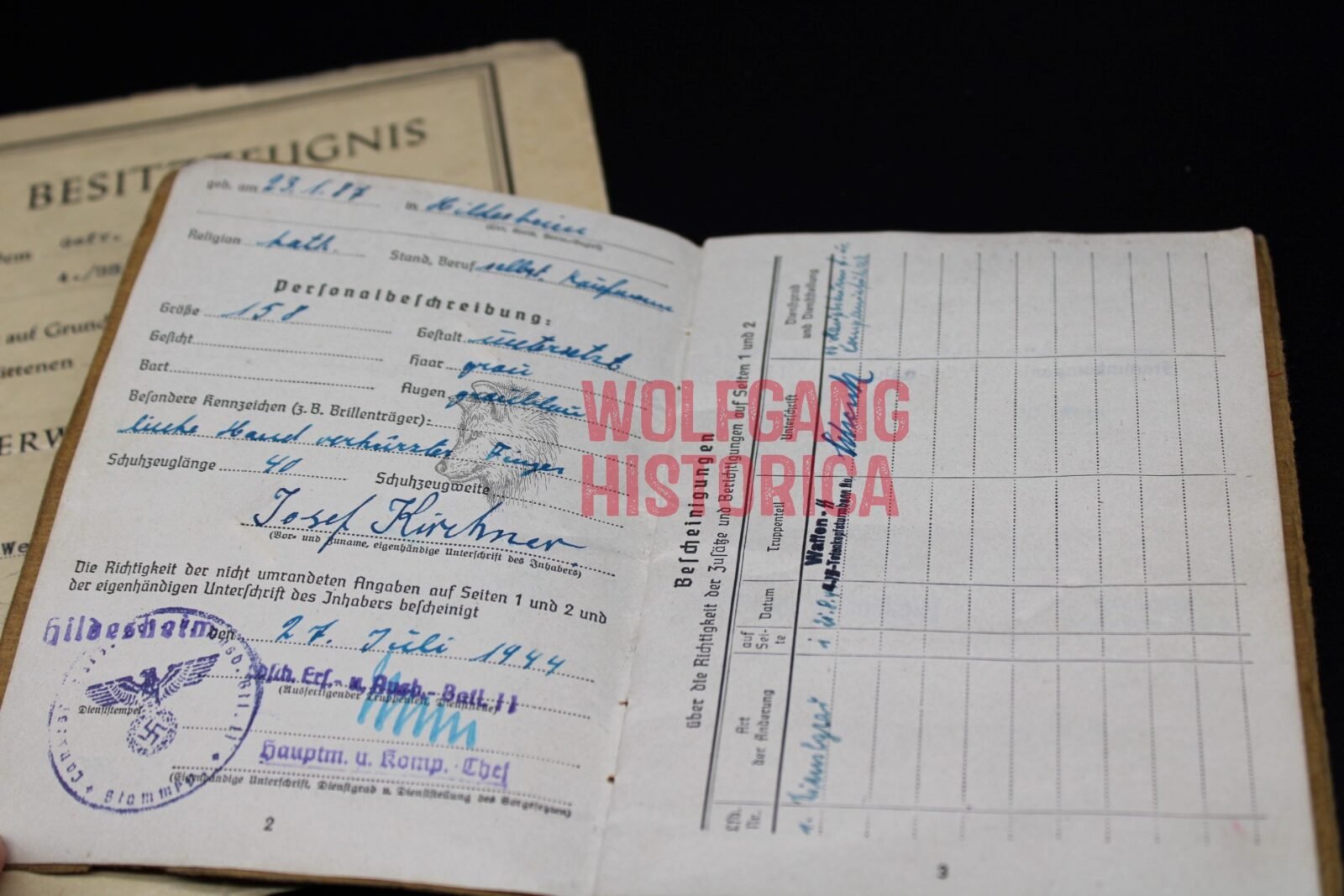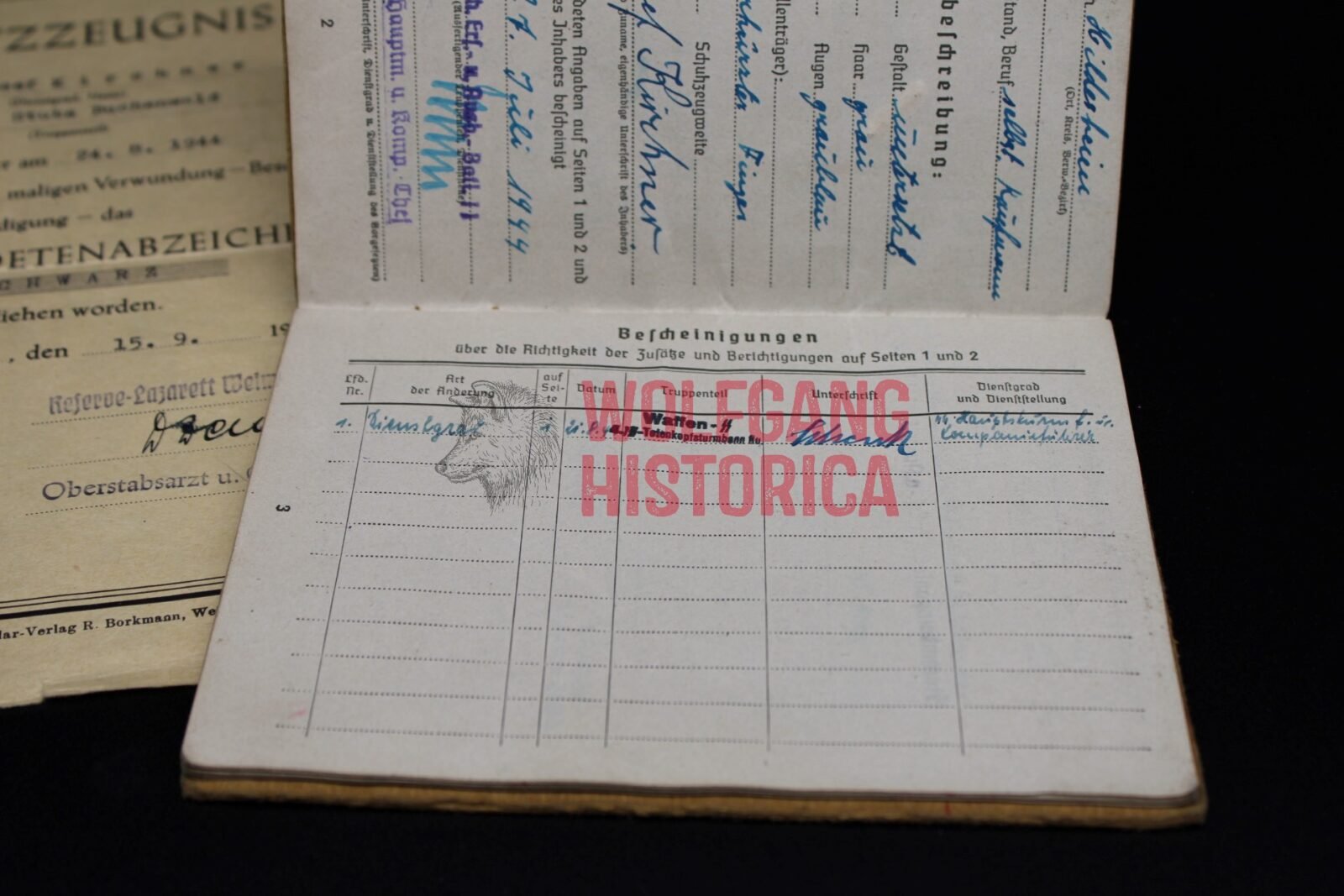 Soldbuch and Award document for a SS-Sturmmann / Gefreiter Josef Kirchner. The Soldbuch is complete and has a ID photo in it. He most likely (according to info in the Soldbuch) was transferred from a reserve Wehrmacht training unit to the SS-Totenkopf-Sturmbann “Buchenwald”. Several stamps of Buchenwald as well as signatures from SS-Hauptsturmführer Schenk (not much known, in one of the books you’ll read he’s mentioned as leader of the Musikkorps) and SS-Obersturmführer Bruno Dembeck. Dembeck was notorious for torturing and killing inmates in Sachsenhausen, Dachau and Buchenwald. He died in December 1944, only two months after signing Kirchner’s leave entry. This comes with Kirchner’s award document for the Verwundetenabzeichen in Schwarz, which he was awarded for his wound(s) suffered on August 24, 1944 when the KZ Buchenwald was bombed!