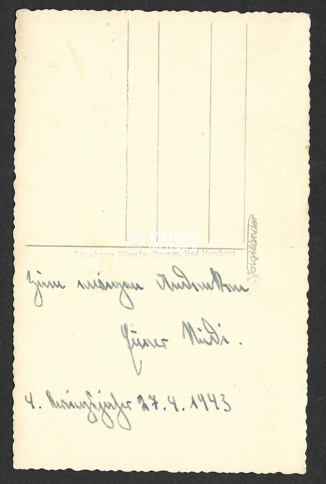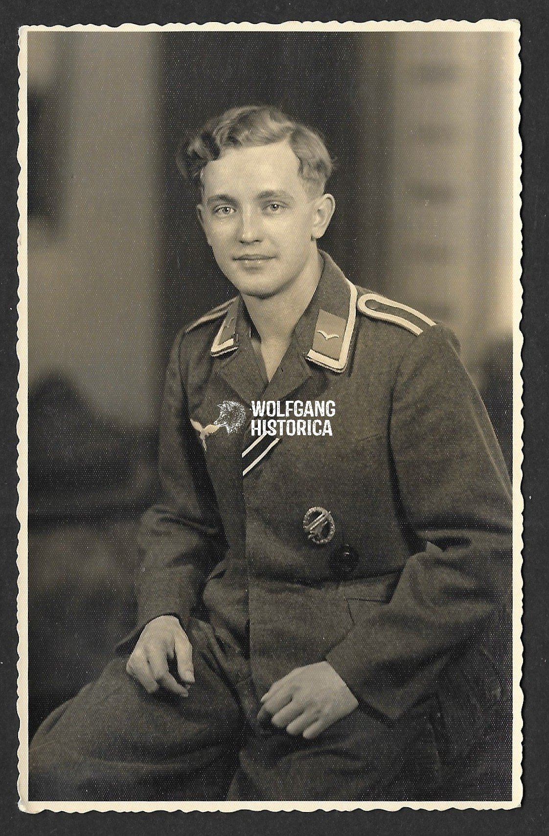 Original Studioportrait of a Luftwaffe Fallschirmjäger (Paratrooper) wearing the Fallschirmschützen-Abzeichen (Paratrooper’s Badge) en Verwundetenabzeichen in Schwarz (Wound Badge in Black). Postcardsize. Condition as seen.