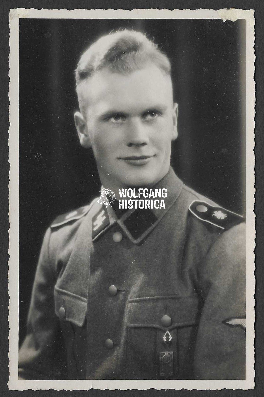 Original Studioportrait of a Waffen-SS soldier from the 1. SS-Panzer-Division “Leibstandarte-SS Adolf Hitler”. Stunning portrait with the “LAH” Shoulderboards and HJ/Pol. badges being worn. Postcardsize. Condition as seen.