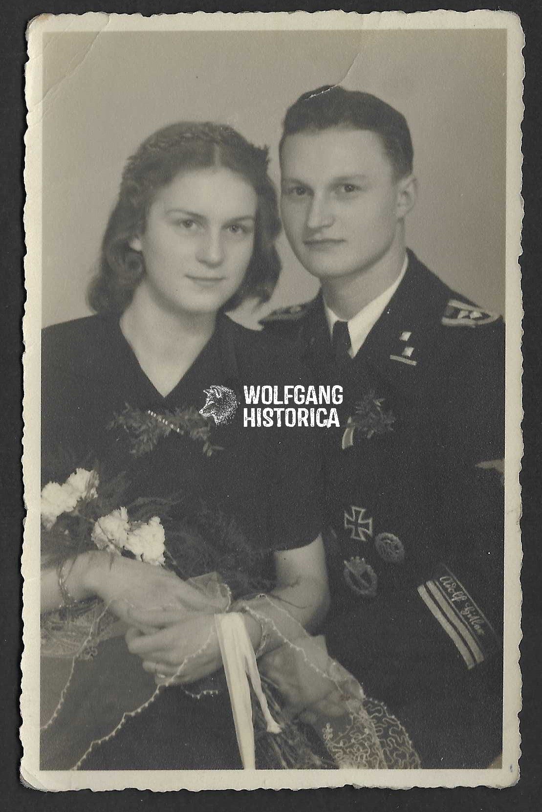 Original Studioportrait of a “LSSAH” NCO at the rank of SS-Hauptscharführer with “Spieß” tresse, wearing a Panzer wrapper; several awards and the “Adolf Hitler” Cufftitle! Together with his wife. Top portrait. Postcardsize.