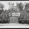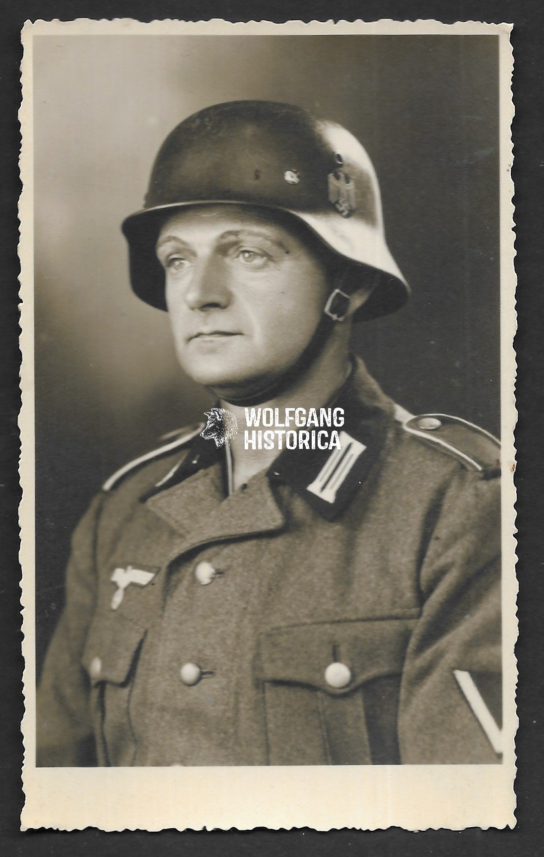 Original Wehrmacht (Heer) studioportrait of a soldier wearing a helmet with decal. Postcardsize. Condition as seen.