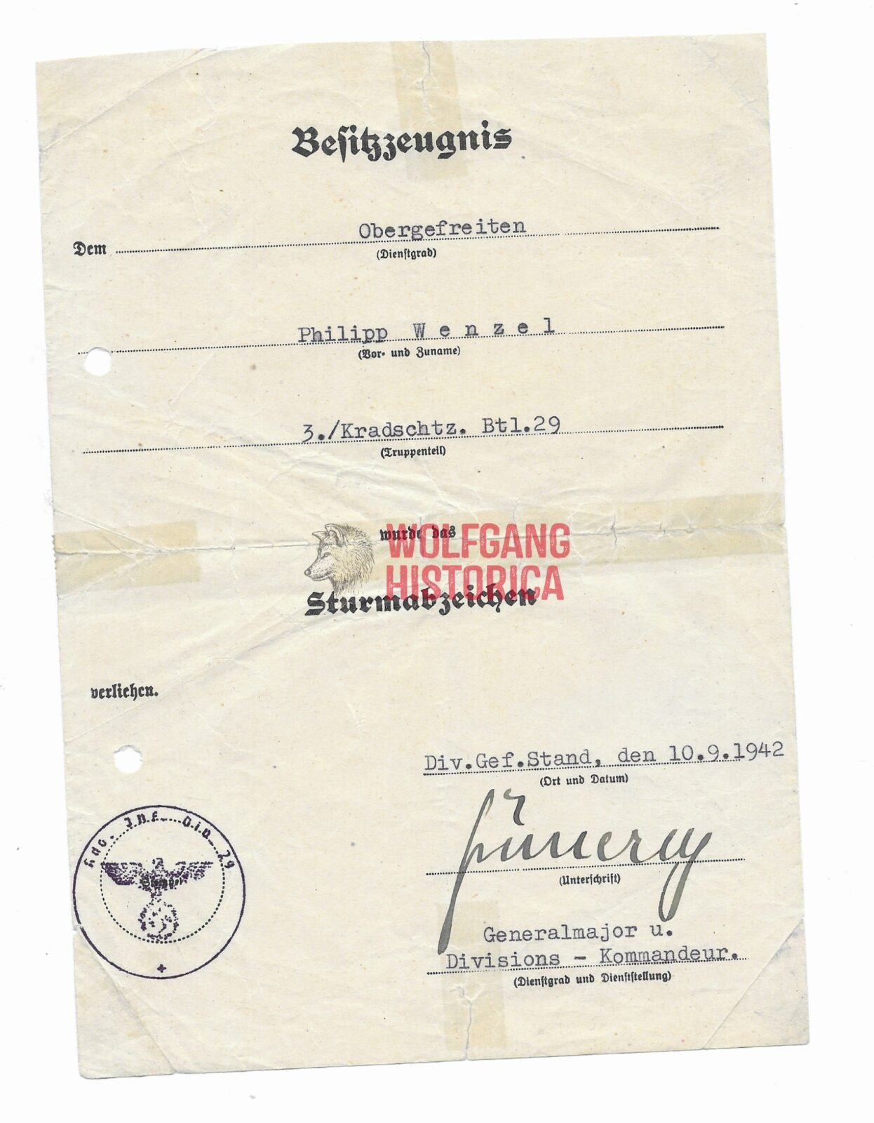 Award document of Obergefreiter Philipp Wenzel, who served with the 3. Kompanie/ Kradschützen-Bataillon 29 of the 09. Infanterie-Division, for the Allgemeines-Sturmabzeichen (General Assault Badge) on September 10, 1942 during the Battle for Stalingrad for 3 assault days during his service! Document was signed by Generalmajor Max Fremerey (RK). Has been folded in the past and punched. Condition as seen!