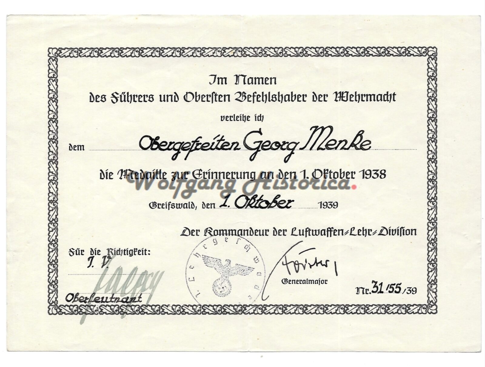 Award document of Obergefreiter Georg Menke for the Medaille zur Erinnerung an den 1. Oktober 1938 (1 October 1938 Medal also known as Sudetenland Medal) who served with the Luftwaffe-Lehr-Division!