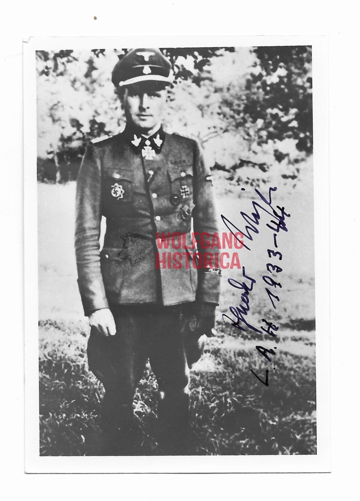 Original Postwar Signature on a Postwar Photo of Theodor “Teddy” Wisch. SS-Brigadeführer und Generalmajor der Waffen-SS Theodor “Teddy” Wisch (13.12.1907 † 11.01.1995) earned the Ritterkreuz on September 15, 1941 as SS-Sturmbannführer und Kommandeur of the II. Bataillon/ “LSSAH”, the Eichenlaub on February 12, 1944 as SS-Brigadeführer und Kommandeur of the 1. SS-Panzer-Division “LSSAH” and the Schwertern on August 30, 1944 as SS-Brigadeführer und Generalmajor der Waffen-SS of 1. SS-Panzer-Division “LSSAH”. Good condition. Measuring: 8,8×12,6cm.