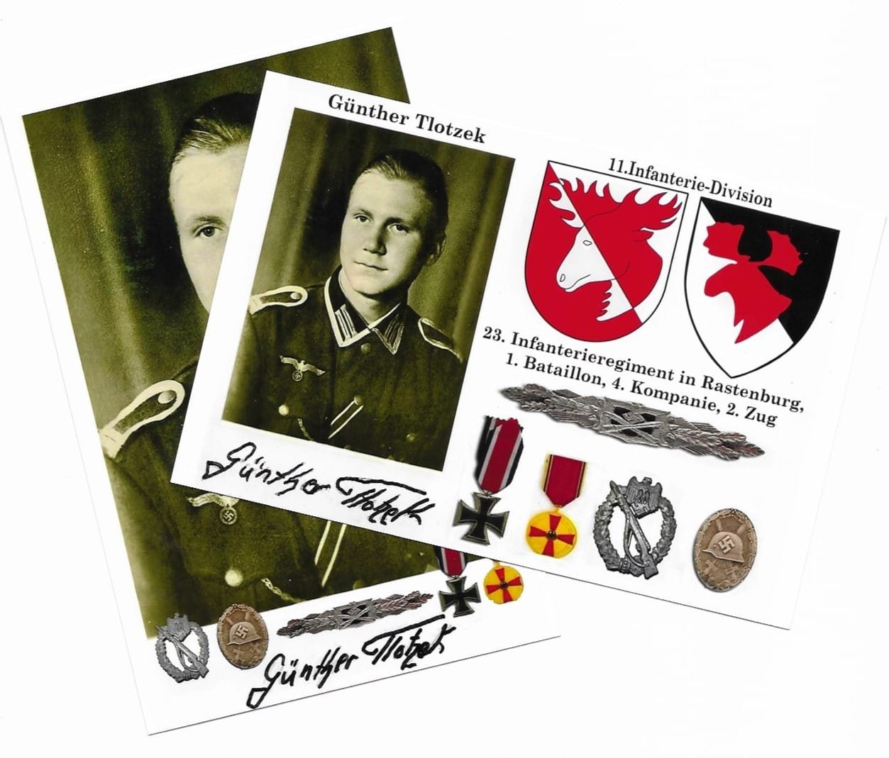 Served in the Infantrie-Regiment 23, 11. Infantrie-Division of the German Wehrmacht during WWII. Günther Tlotzek saw the light of day in 1923 in Sokolken in East Prussia. He was at the front in Russia for four years and was wounded four times, of which he still has fragments of grenade in his left thigh. He was also in Russian captivity in Siberia for five years after the end of the war and was expelled from his East Prussian homeland. These are just a few points from Günther Tlotzek’s eventful life. In this book he tells of his memories, from childhood to old age. These include experiences from the Weimar period, from the National Socialist period, and all of his experiences from World War II. He also describes his 5-year captivity and his”new second life” afterwards. Günther Tlotzek remained mentally alert and fit into old age, he is open to everything new and today lives in and with digital progress. “A so-called fulfilled life can only exist if you have given something to others.” G.Tlotzek