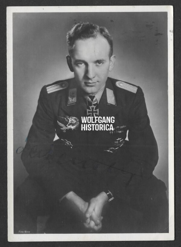 A highly regarded Luftwaffe ace and recipient of the Knight’s Cross with Oak Leaves and Swords, Weissenberger’s autograph on period material is scarce and much sought after by collectors. This signed postcard, with confirmed wartime provenance, represents an authentic and desirable example of Luftwaffe history.