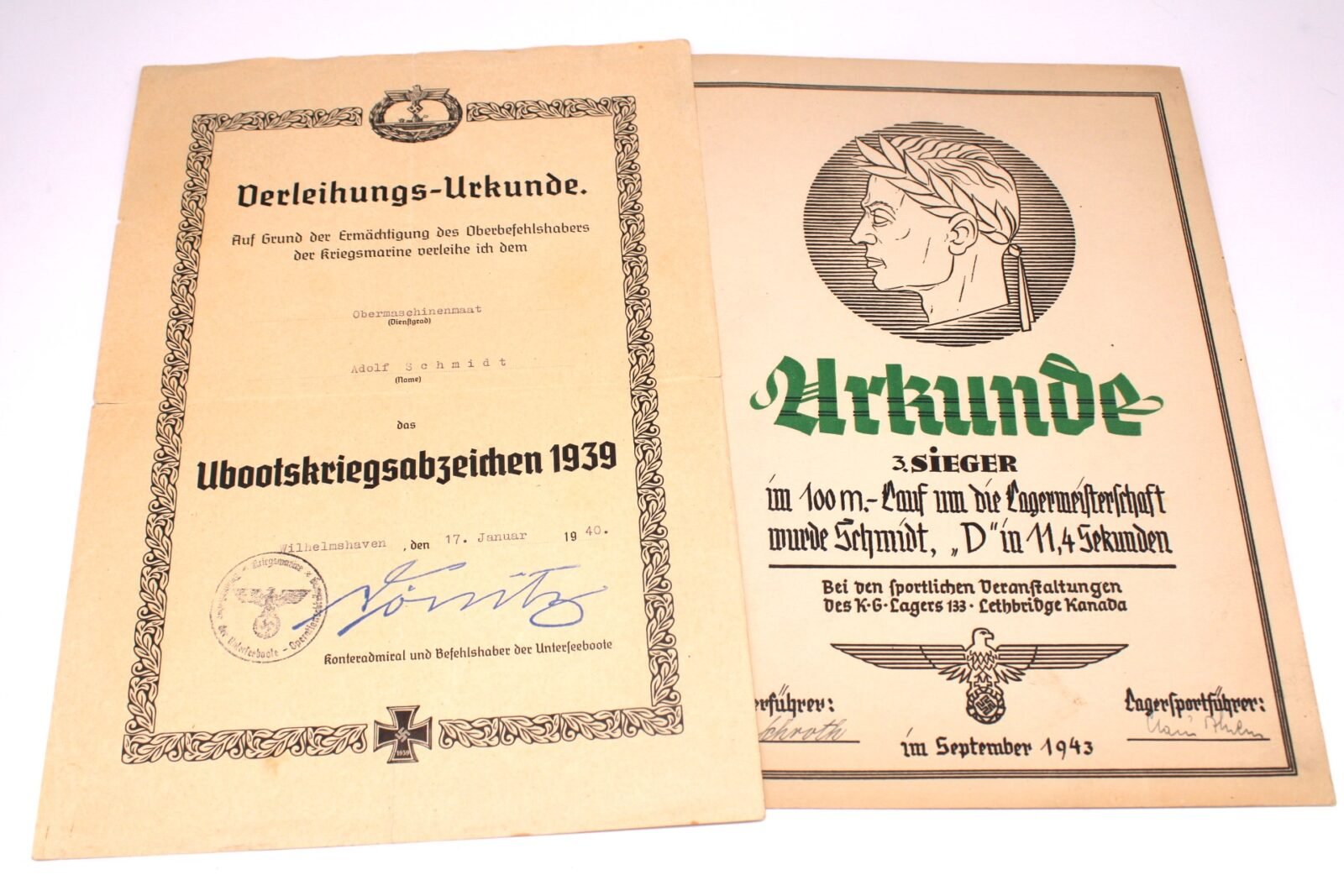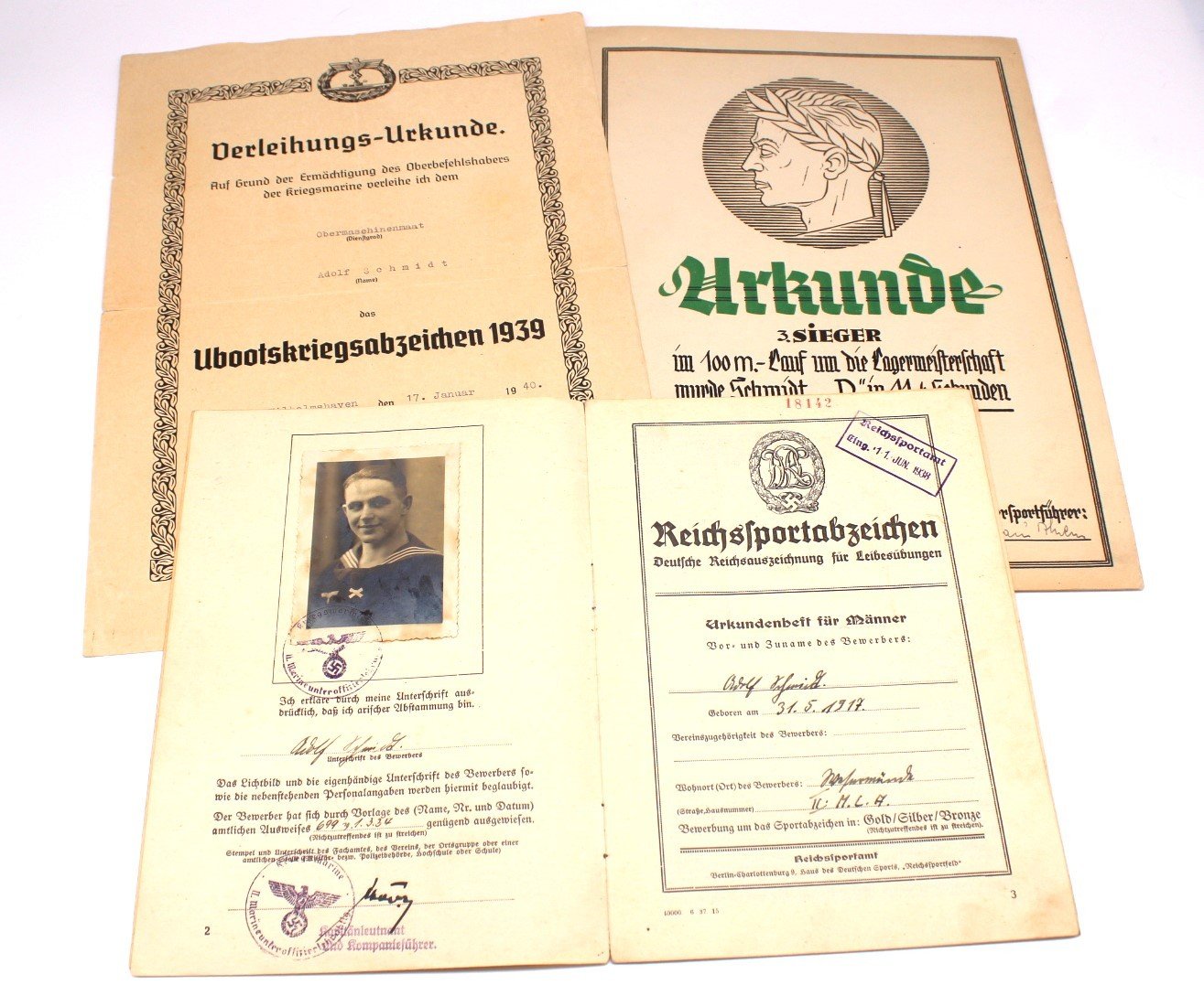 Original U-boot-Kriegsabzeichen (U-Boat War Badge) award document for Obermaschinenmaat Adolf Schmidt, awarded in 1940! He may have served on U-40. Comes with a DRL-Sportabzeichen award document (with photograph!) and a 100m run award certificate for third place.