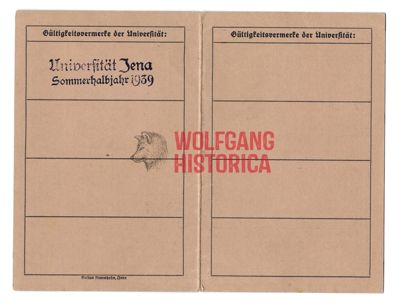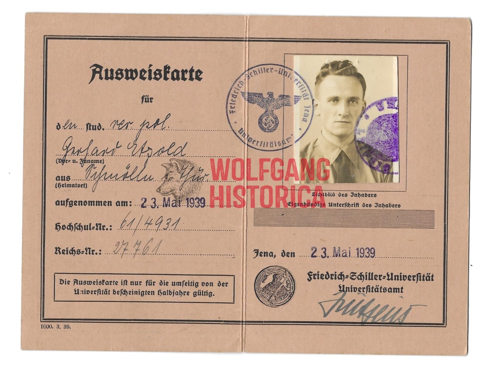 Ausweiskarte for the Friedrich-Schiller-Universität of Gerhard Etzold. Oberleutnant Gerhard Etzold (17.03.1910 † 06.05.1941) earned the Ritterkreuz on June 3, 1940 as Oberleutnant und Zugführer in the 5. Kompanie/ Kradschützen-Bataillon 8 of the 8. Panzer-Division. Good Condition.
