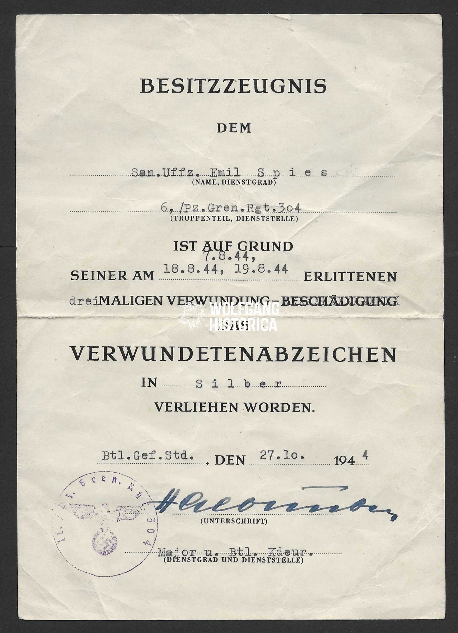 Original Verwundetenabzeichen in Silber (Wound Badge in Silver) award certificate for Sanitäts-Unteroffizier Spies who served with the Panzergrenadier-Regiment 304 and was wounded 3x times (!) during the Battle of Normandy in August 1944. Condition as seen.
