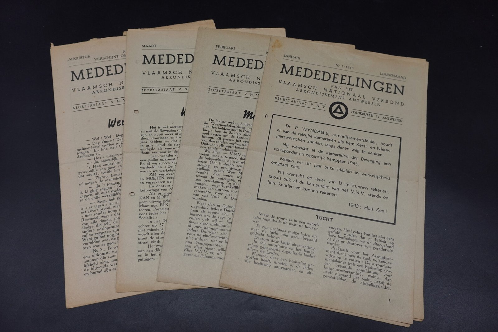 Authentic original issues of “Mededeelingen” published by the Vlaamsch Nationaal Verbond (VNV), dated 1943. Historical World War II–era printed material.
