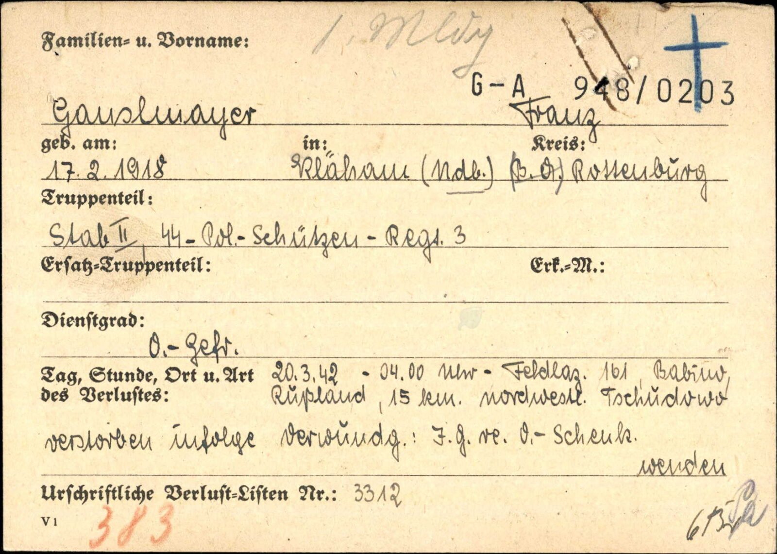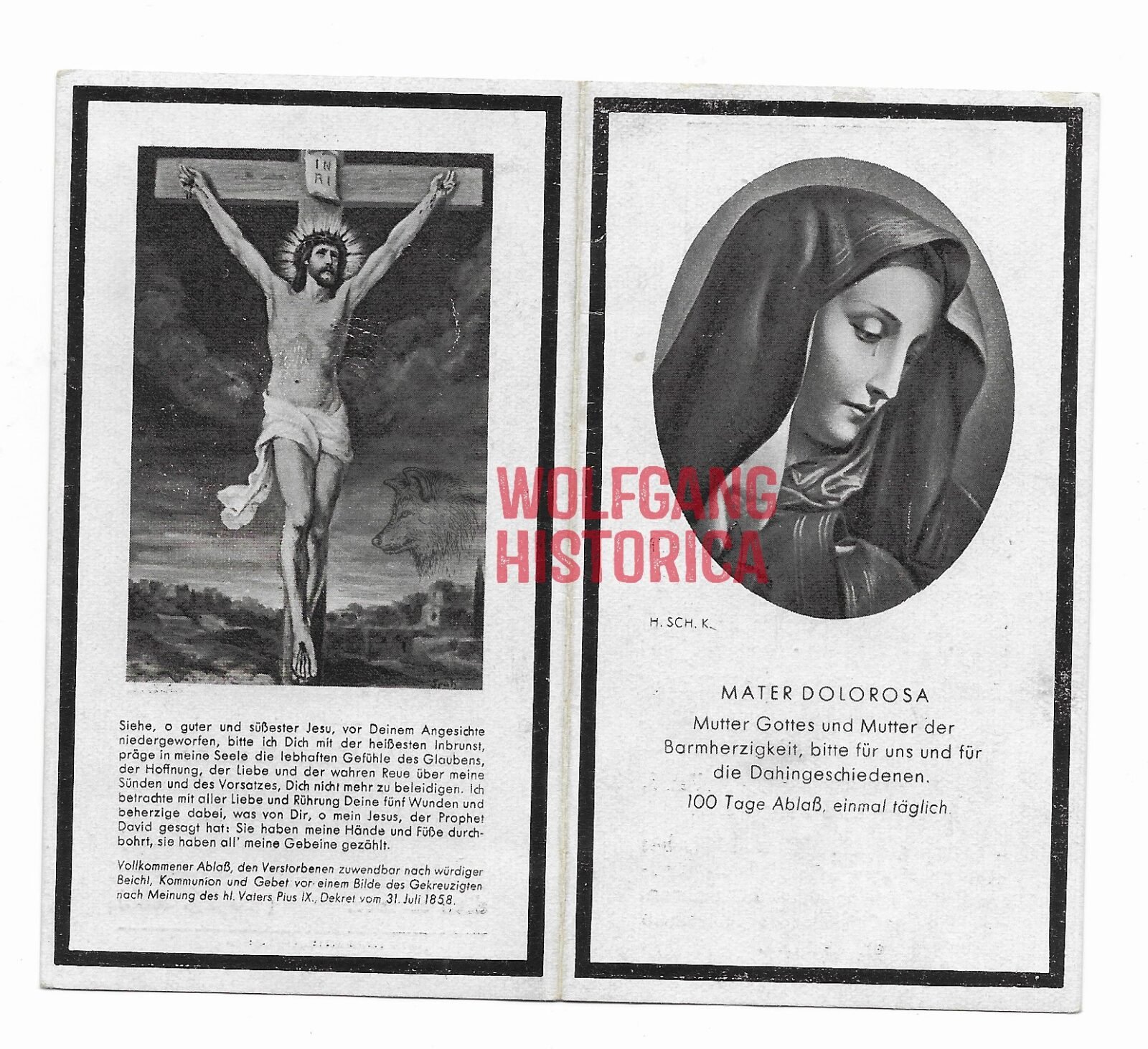Waffen-SS Death card for Obergefreiter der SS-Polizei Franz Ganslmeyer, who was Killed in Action on March 20, 1942on the Eastern Front. He served with the Stab II./ SS-Polizei-Schützen-Regiment 3.