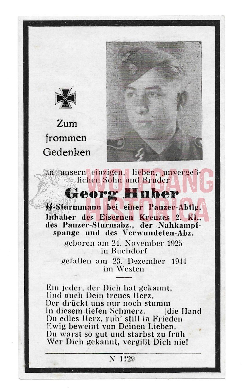 Waffen-SS Death card for SS-Sturmmann Georg Huber, who was KIA on December 23, 1944 in the West. He earned the Nahkampfspange, Panzerabzeichen, EK2 and Verwundetenabzeichen.