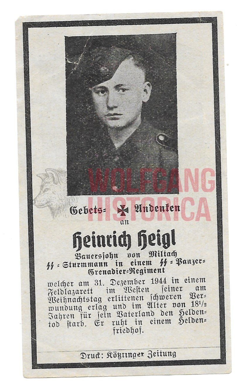 Waffen-SS Death card for SS-Sturmmann Heinrich Heigl, who died on December 31, 1944 in a field hospital in the West as a result of severe wounds received on Christmas day.