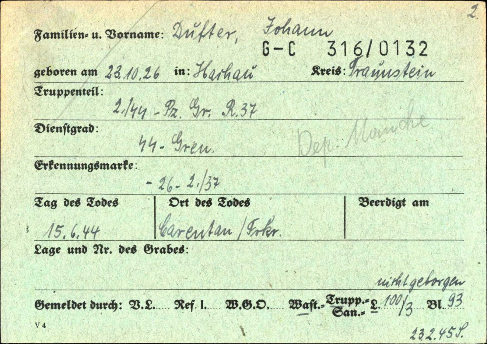 Waffen-SS Death card for SS-Grenadier Johann Dufter who lost his life at the age of 17 on June 15, 1944 in Carentan, Normandy while serving with the 2. Kompanie/ SS-Panzer-Grenadier-Regiment 37 “Götz von Berlichingen”! (Info via Ancestry; see info card, illustration only)