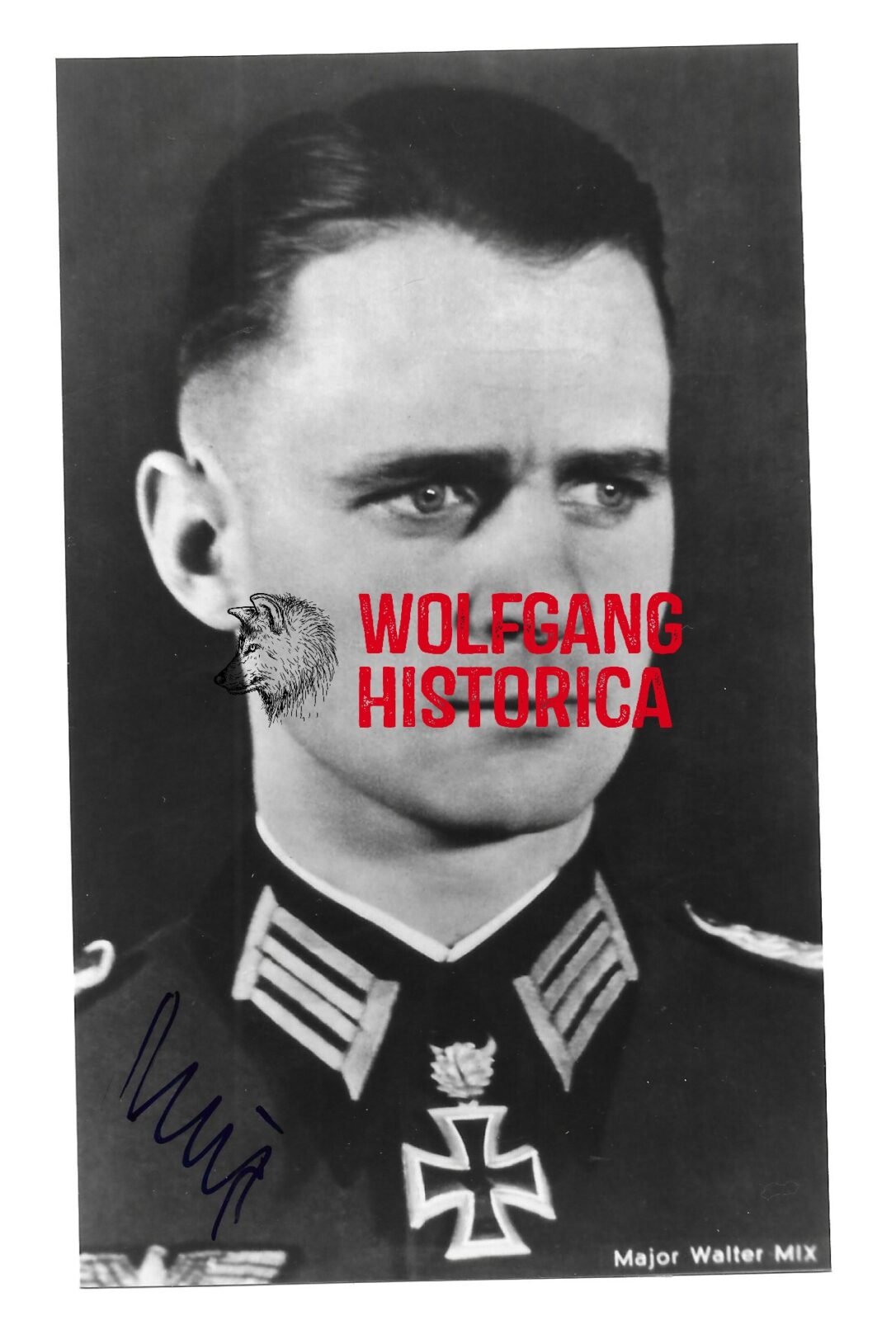 Original Postwar Signature on a Postwar Photo of Walter Mix. Hauptmann Walter Max (21.12.1917 in Deutsch-Krone † 17.11.2004 in Bad Bevensen) earned the Ritterkreuz des Eisernen Kreuzes on December 18, 1942 as Oberleutnant und Chef of the 9. Kompanie/ Grenadier-Regiment 174 and the Eichenlaub on February 22, 1944 as Hauptmann und Kommandeur of the II. Bataillon/ Grenadier-Regiment 174 of the 81. Infanterie-Division.