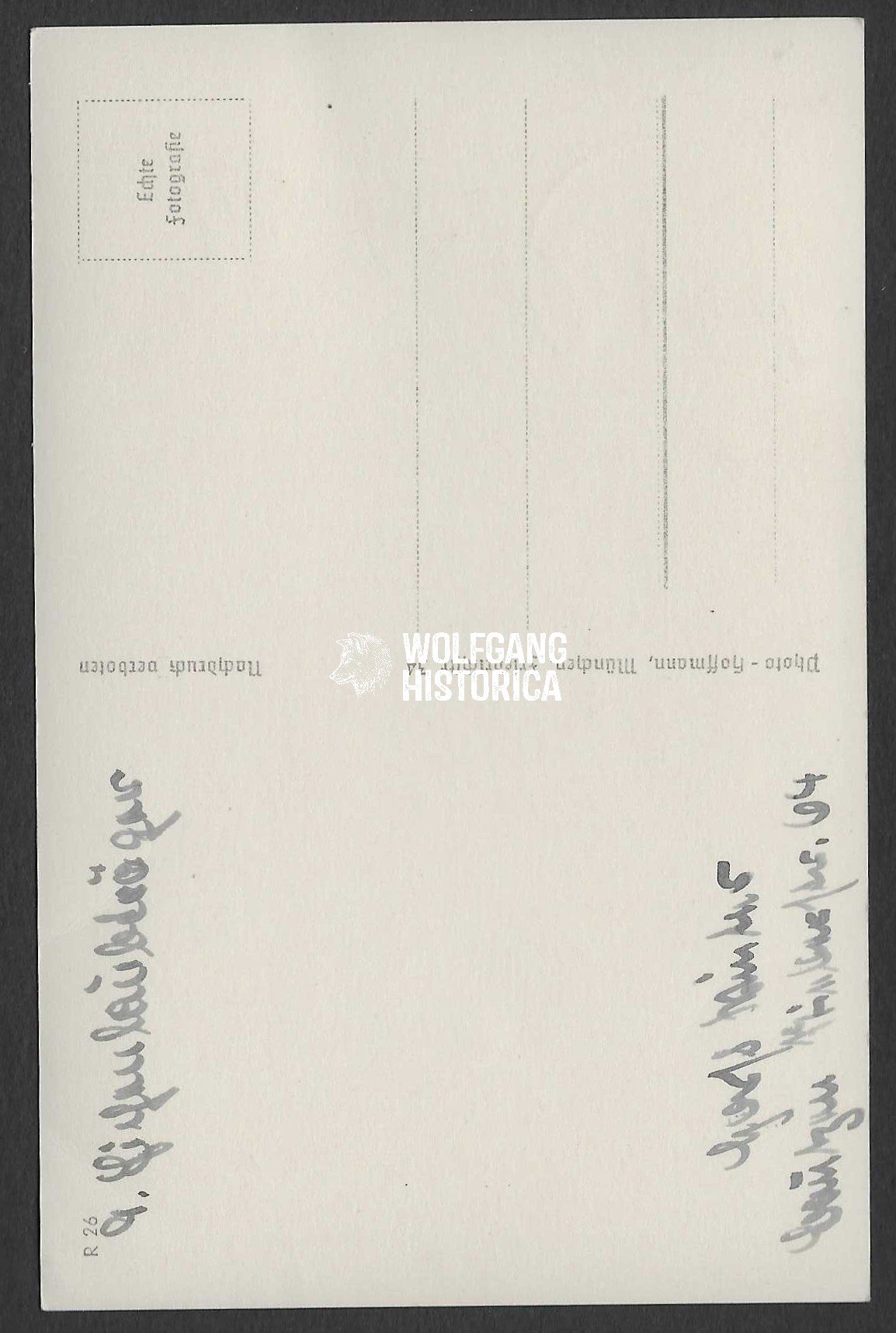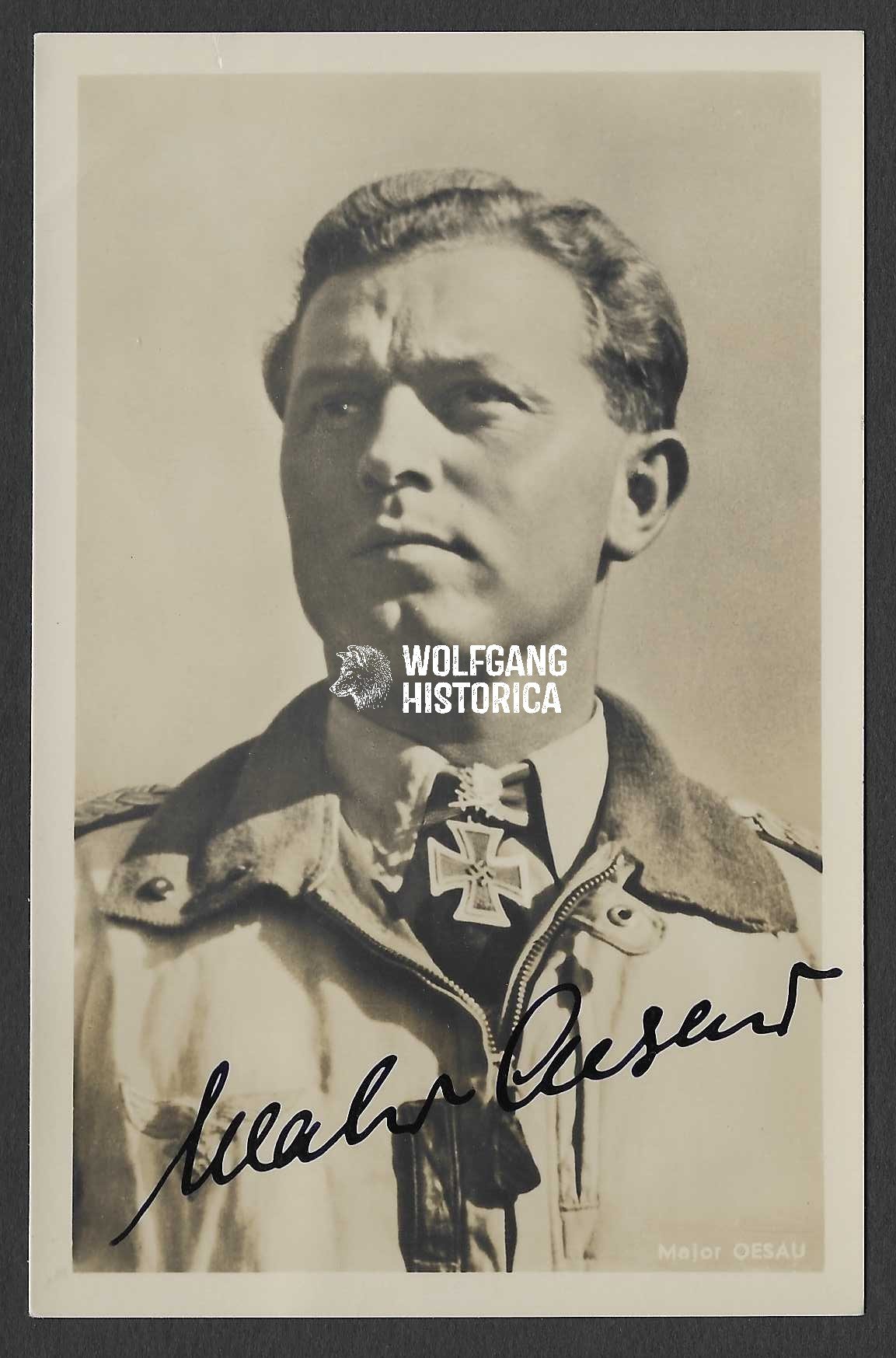 Original Wartime Signature on a Postcard of Walter Oesau. Oberst Walter Oesau (28.06.1913 † 11.05.1944) earned the Ritterkreuz des Eisernen Kreuzes on August 21, 1941 as Hauptmann und Staffelkapitän of the 7. Staffel/ Jagdgeschwader 51, the Eichenlaub on February 6, 1941 as Hauptmann und Kommandeur of the III. Gruppe/ Jagdgeschwader 3 and the Schwertern on July 15, 1941 as Hauptmann und Kommandeur of the III. Gruppe/Jagdgeschwader 3. He also earned the Deutsches Kreuz in Gold on October 17, 1943 as Oberstleutnant und Jagdfliegerführer 4. He’s credited with 127 aerial victories! Condition as seen. Postcardsize.