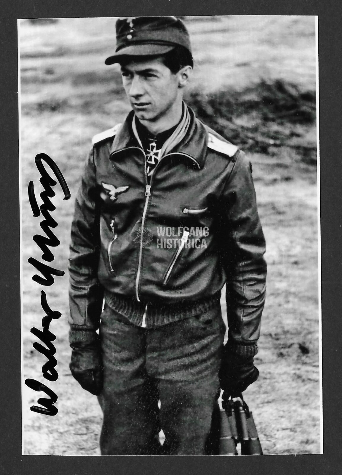 Original Postwar Signature on a Postwar Photo of Walter Schuck. Oberleutnant Walter Schuck (20.07.1920 in Frankenholz † 27.03.2015 in Neunkirchen) earned the Deutsches Kreuz in Gold on June 24, 1943; the Ritterkreuz des Eisernen Kreuzes on April 8, 1944 as Oberfeldwebel und Flugzeugführer in the 7. Staffel/ Jagdgeschwader 5 (after 84 aerial victories) and the Eichenlaub on September 30, 1944 as Leutnant und Flugzeugführer in the 9. Staffel/ Jagdgeschwader 5. Postcardsize.