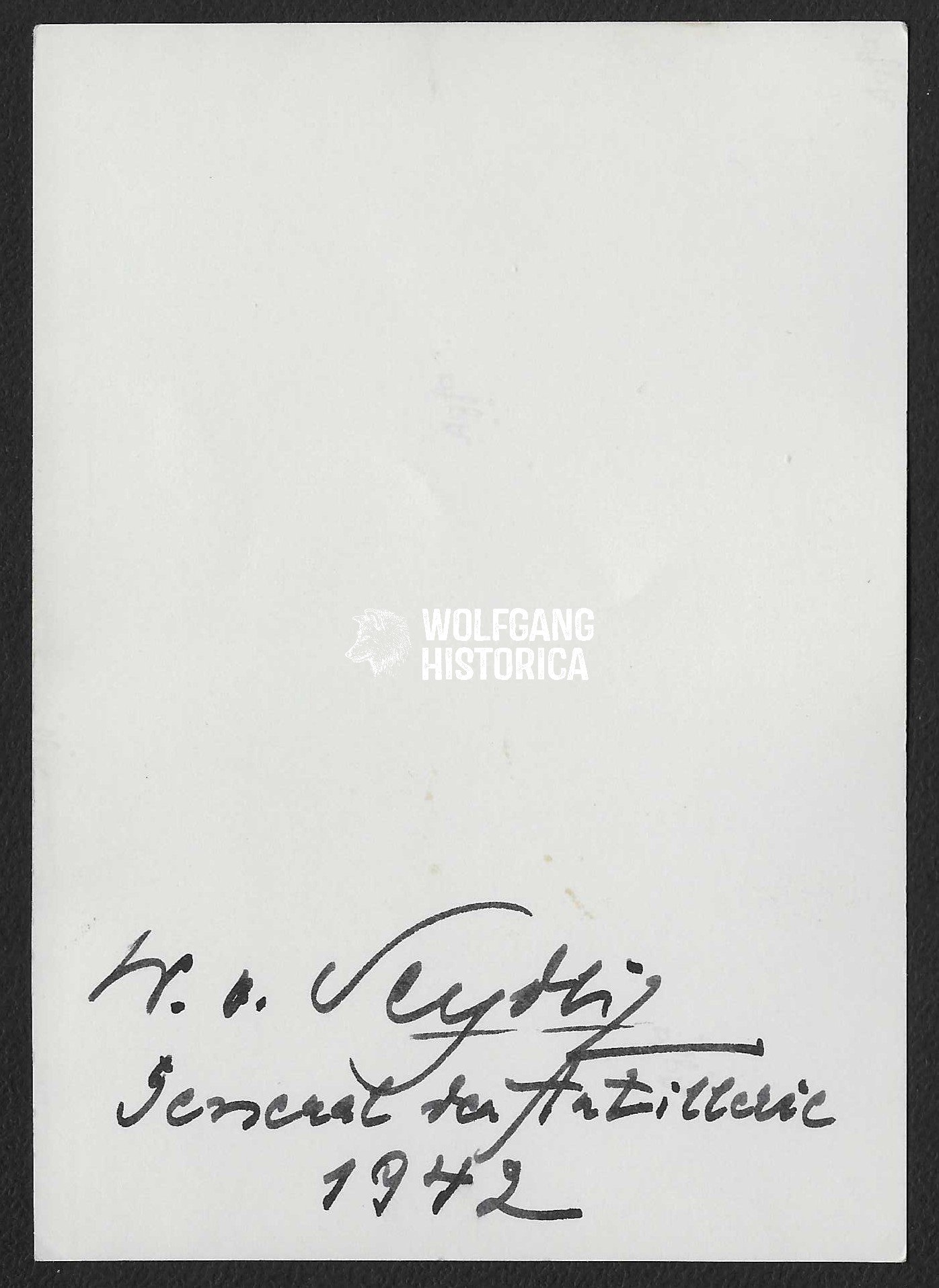 Original Postwar Signature on a Postwar Photo of Walther von Seydlitz-Kurzbach. General der Artillerie Walther von Seydlitz-Kurzbach (22.08.1888 in Hamburg † 28.04.1976 in Bremen) earned the Ritterkreuz des Eisernen Kreuzes on August 15, 1940 and the Eichenlaub on December 31, 1941 as Generalmajor und Kommandeur of the 12. Infanterie-Division. Postcardsize.