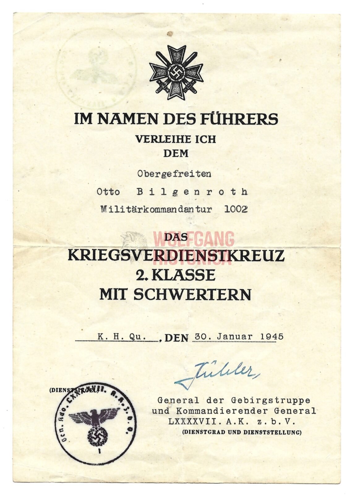 Award document of Obergefreiter Otto Bilgenroth of Militärkommandantur 1002 (in Italy) for the Kriegsverdienstkreuzkreuz 2. Klasse mit Schwertern (War Merit Cross 2nd Class with Swords) signed by General der Gebirgstruppe Ludwig Kübler (RK)! Kübler was hanged after the war in Yugoslavia. Document has been folded in the past.