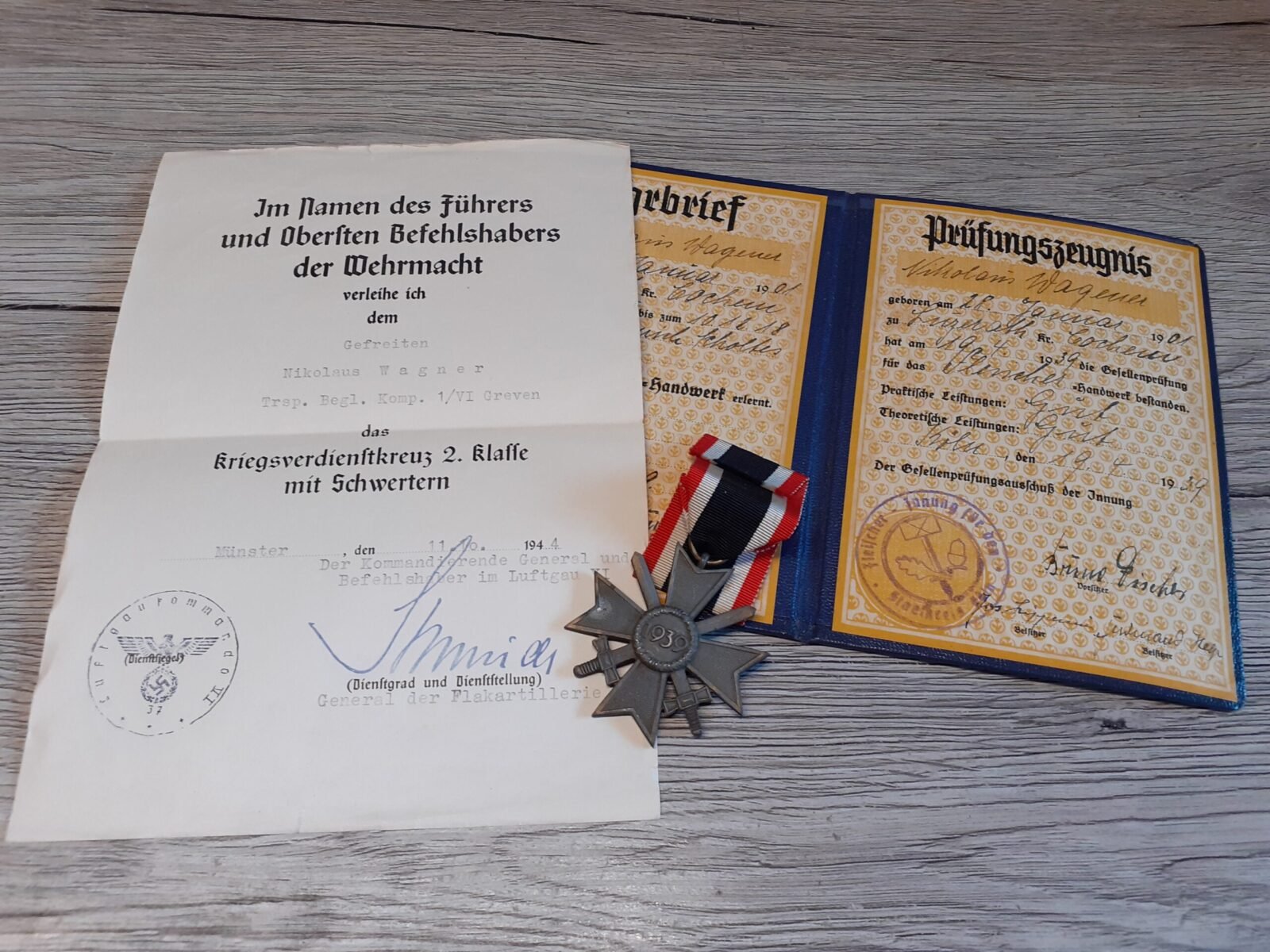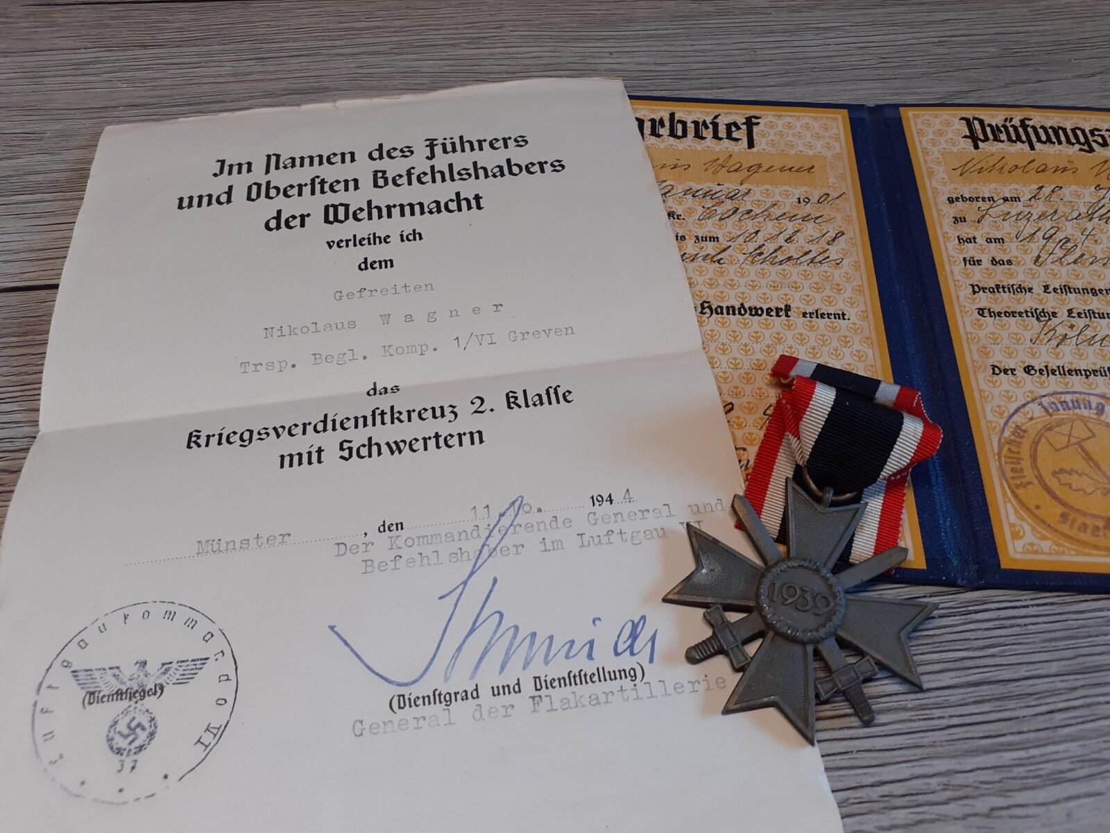 Small set of the award document & KVKII medal of Gefreiter Nikolaus Wagner, who earned the Kriegsverdienstkreuz 2. Klasse mit Schwertern (War Merit Cross 2nd Class with Swords) on October 11, 1944. Stamped by General der Flakartillerie August Schmidt (DKIG + RK). Comes with an extra Prüfungsbrief of him.