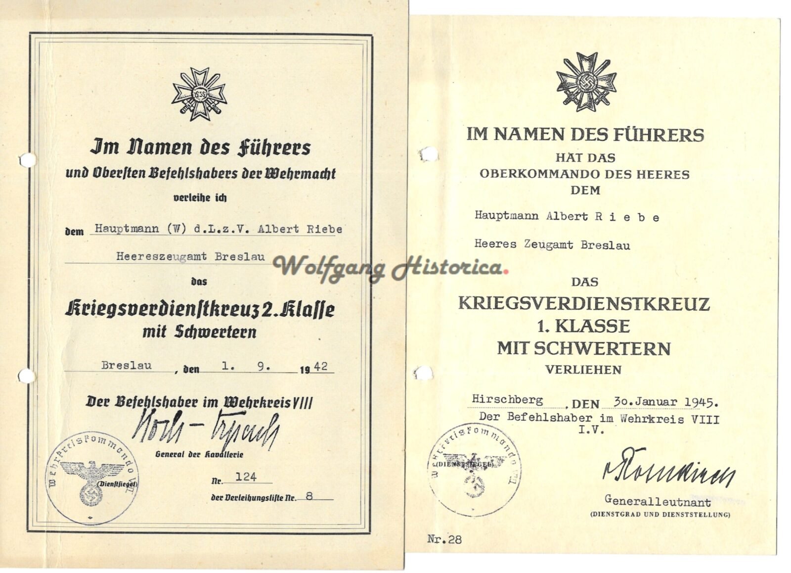 Award document set for the Kriegsverdienstkreuz 2. Klasse mit Schwertern (War Merit Cross 2nd Class with Swords) & Kriegsverdienstkreuz 1. Klasse mit Schwertern (War Merit Cross 1st Class with Swords) of Hauptmann Albert Breslau, who earned them for his service on September 1, 1942 and January 30, 1945 while serving with Heeres-Zeugamt Breslau in Wehrkreis VIII! Both stamped signatures.
