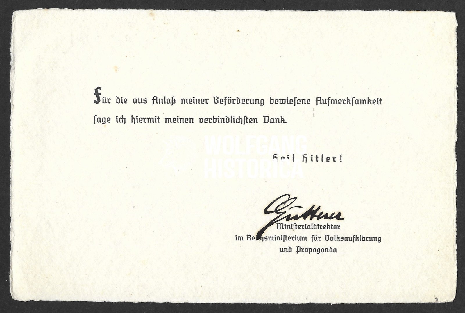 This original wartime thank-you card, personally signed by Gutterer, was issued on the occasion of his promotion within the Ministry. The printed text expresses gratitude for the attention shown upon his advancement, ending with his handwritten signature in black ink.
