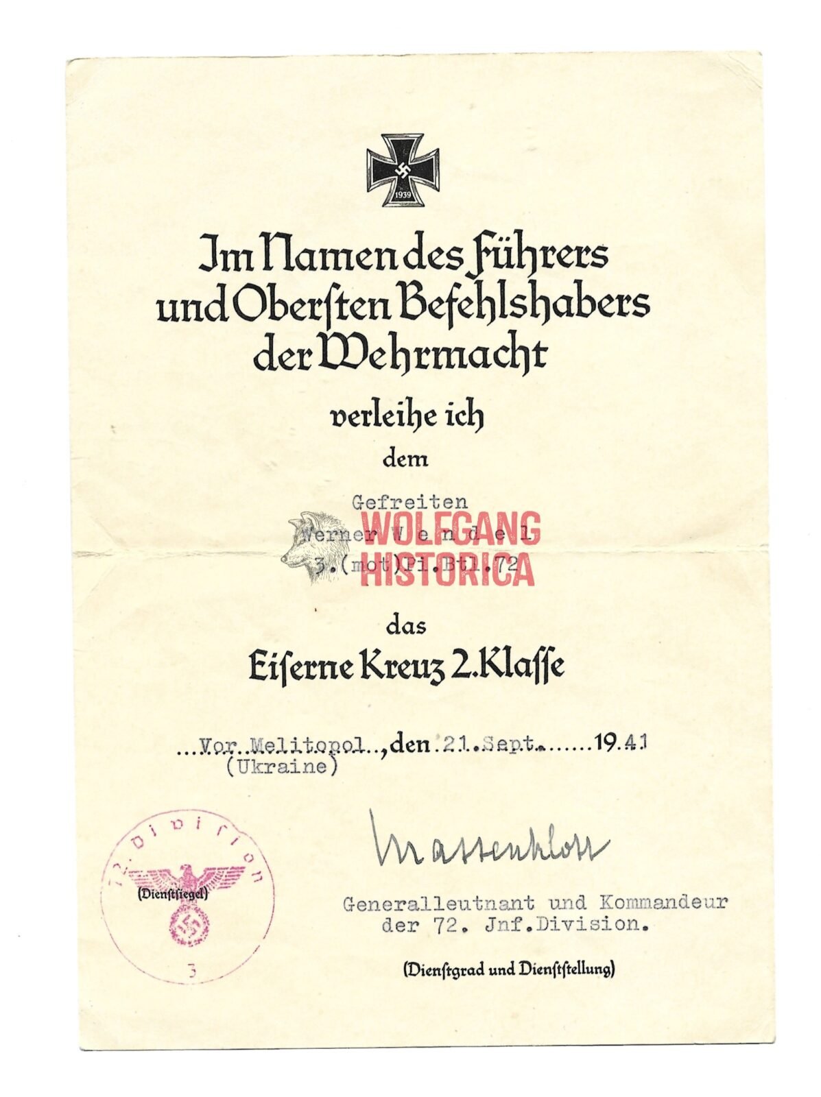 - Award document for the Eisernes Kreuz 2. Klasse (Iron Cross 2nd Class), signed by Generalleutnant u. Kommandeur Franz Mattenklott.