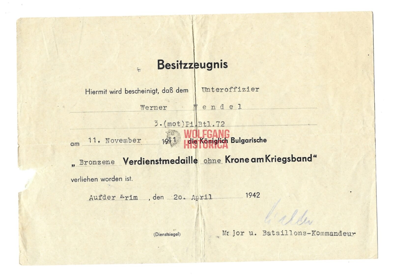 Interestingly it notes the place for the award: “Vor Melitopol (Ukraine)!” - Award document for the Königlich Bulgarische Bronzene Veridenstmedaille ohne Krone am Kriegsband, signed by an unknown officer.