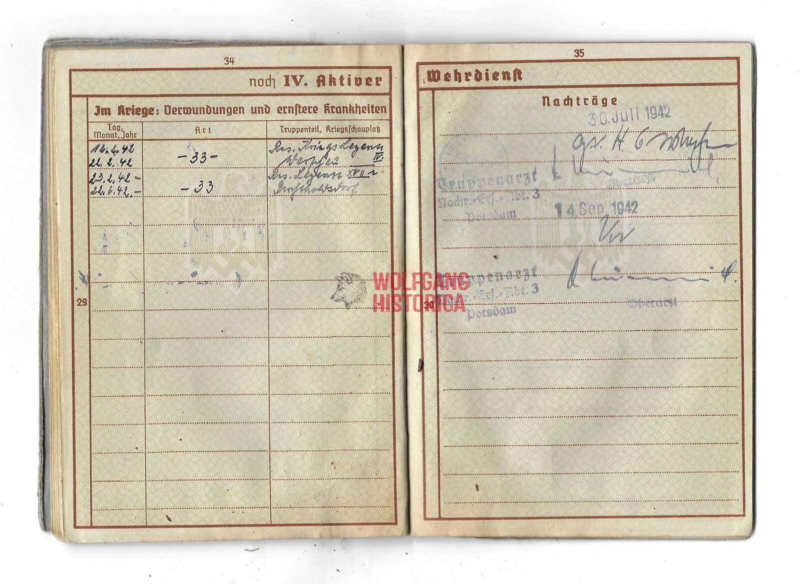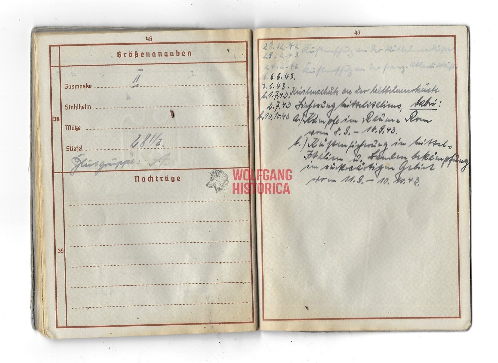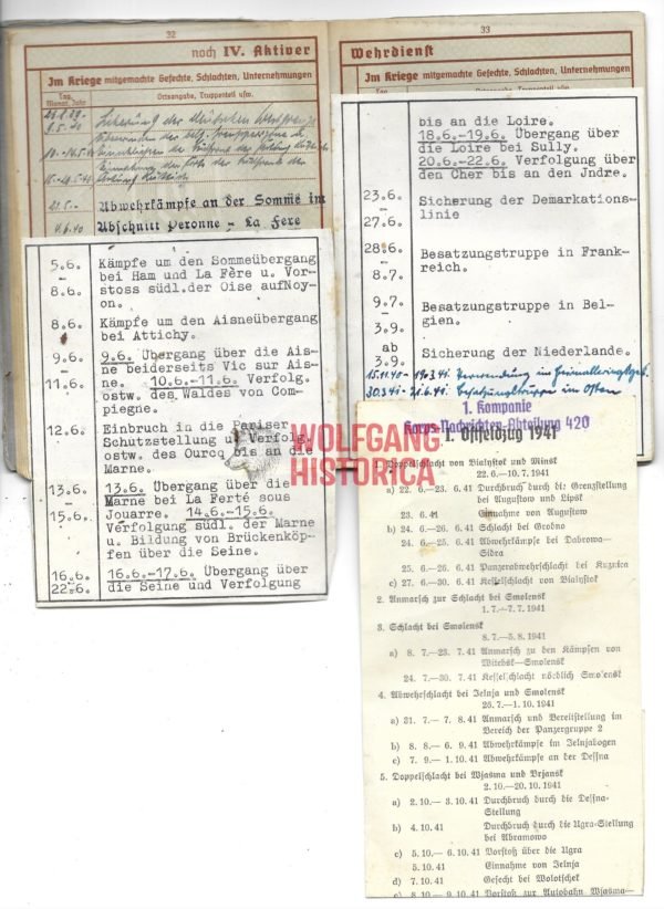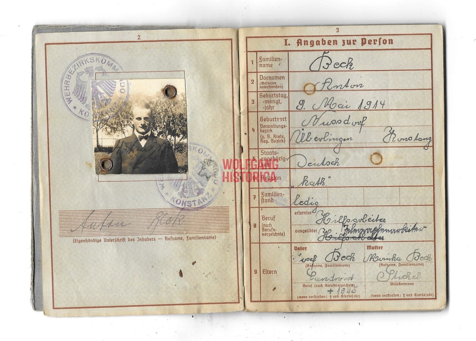 Interesting (Westernfront) Wehrpass of Obergefreiter Beck, who served with the Korps-Nachrichten-Abteilung 420, Nachrichten-Abteilung 386 and Divisions-Nachrichten-Abteilung (mot.) 3 of the 3. Panzer-Grenadier-Division. The 3. Infanterie-Division was destroyed in Stalingrad and later rebuild and reformed as a Panzer-Grenadier-Division. This division fought atSalerno, Cassino & Anzio in Italy, France, Germany, the Ardennes-Offensive & ending in the Ruhr pocket.