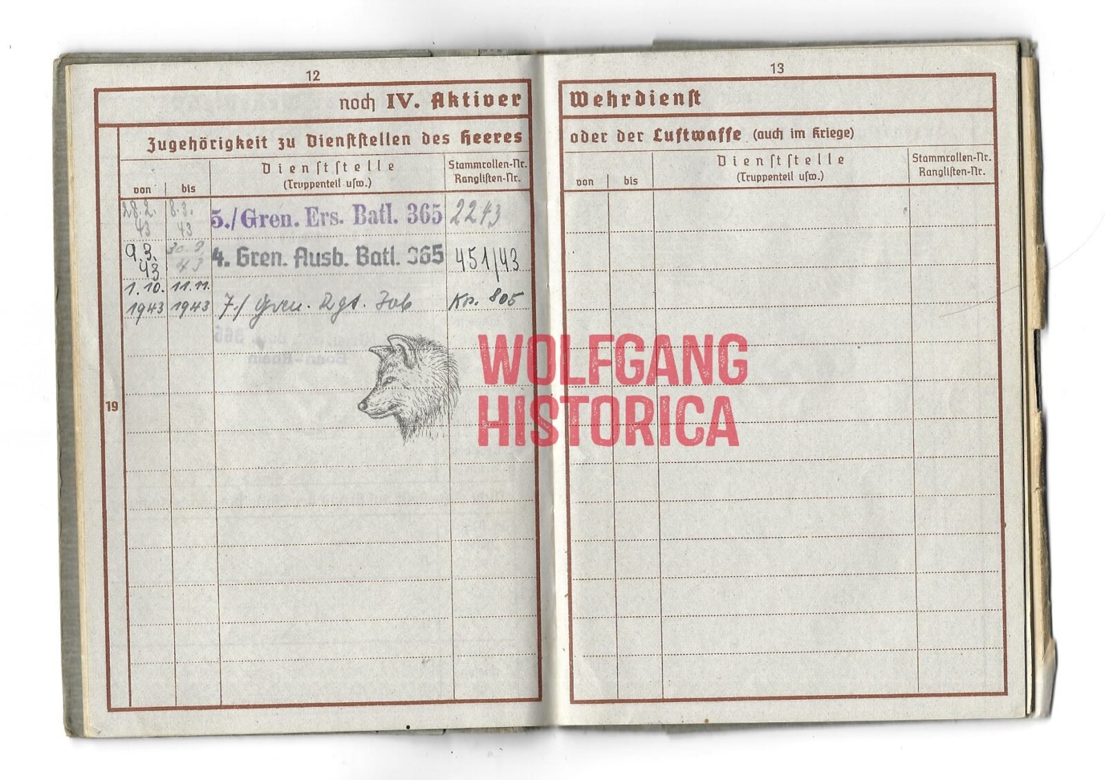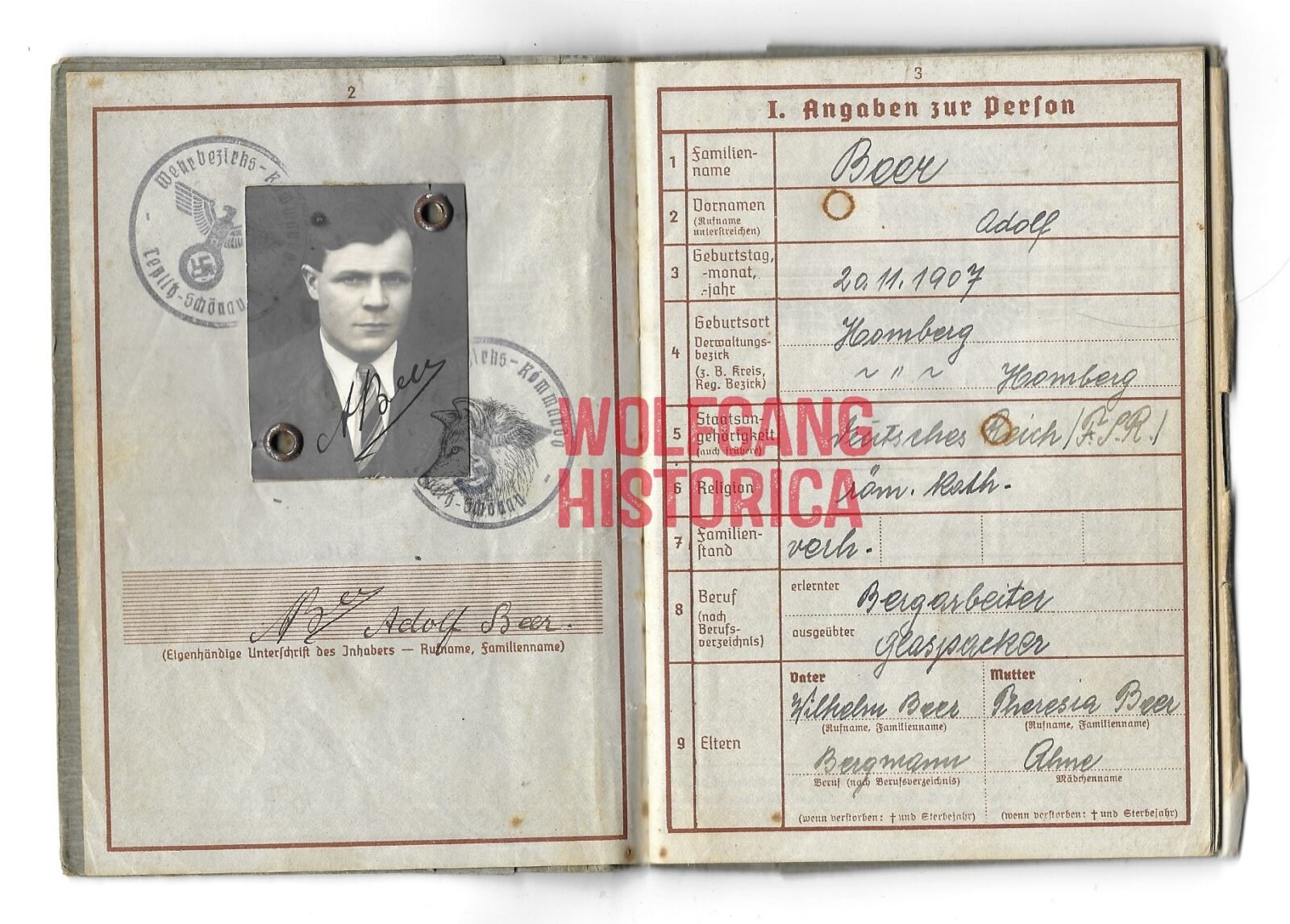 Wehrpass of Adolf Beer, who served with the Grenadier-Regiment 306 of the 211. Infanterie-Division. He was Killed in Action on November 11, 1943. Interestingly, he spoke ‘holländisch‘ (Dutch) as noted in the Wehrpass. Good condition.