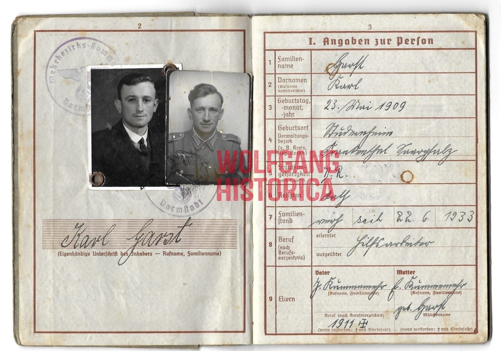 Wehrpass of Obergefreiter Kurt Garst (?) from the Infanterie / Grenadier-Regiment 559 of the 331. Infanterie-Division. During his service, he earned the Winterschlacht im Osten 1941/42 & Kriegsverdienstklasse 2. Klasse. Comes with a small photo of him in uniform. Good condition.