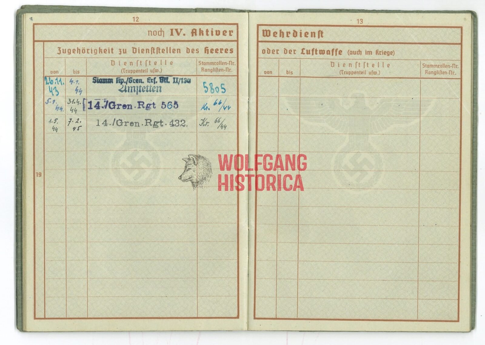 Wehrpass – Grenadier-Regiment 565 & 432 (131.Inf.Div.) (Kowel, 3x Wounded)
