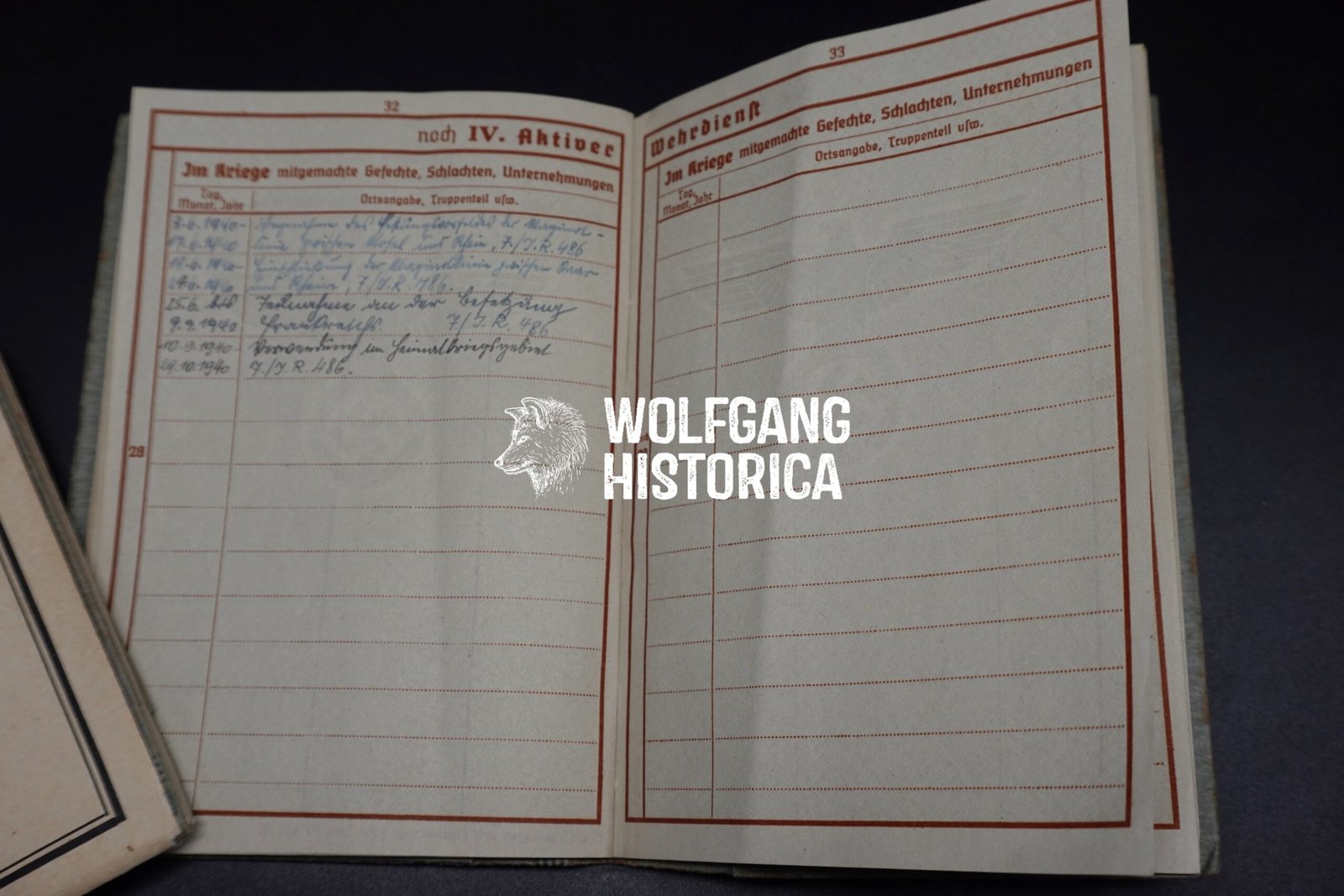 Original World War II Wehrpass issued to a German soldier who served with the 7. Kompanie/ Infanterie-Regiment 486 of the 262. Infanterie-Division. Toward the end of his military service, he was assigned to Heimatflakbatterie 24/XVII, reflecting the late-war reassignment of personnel to home air-defense units.