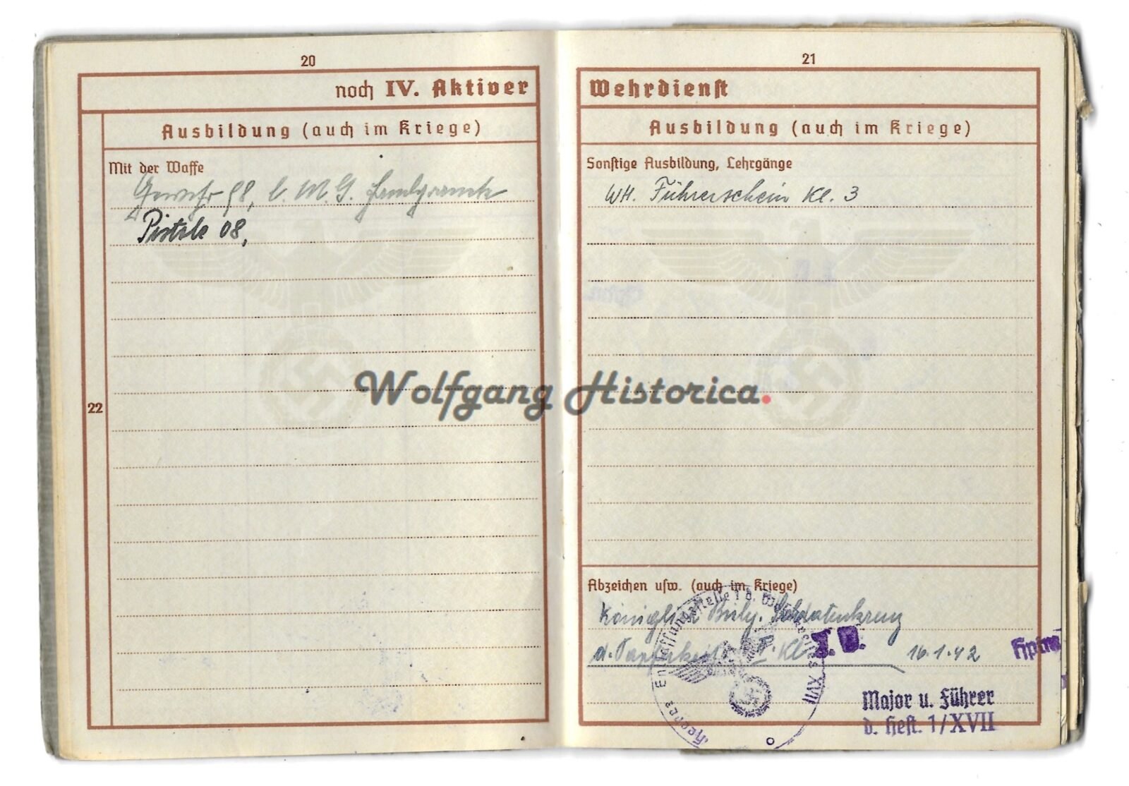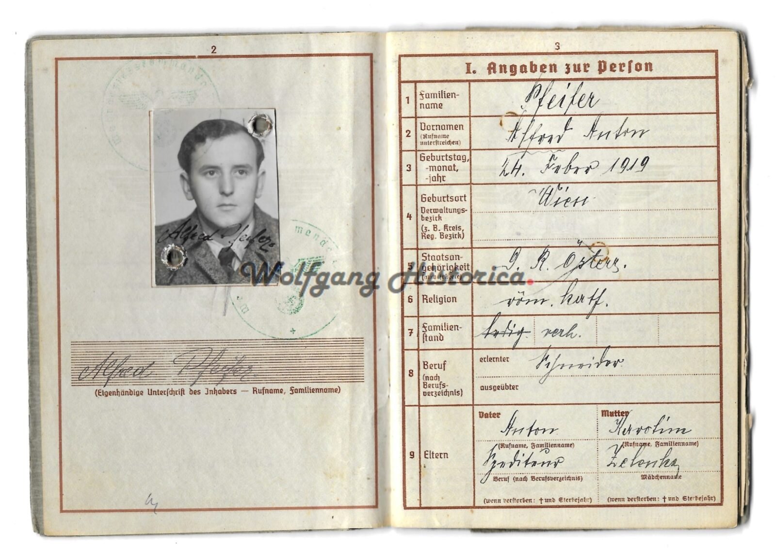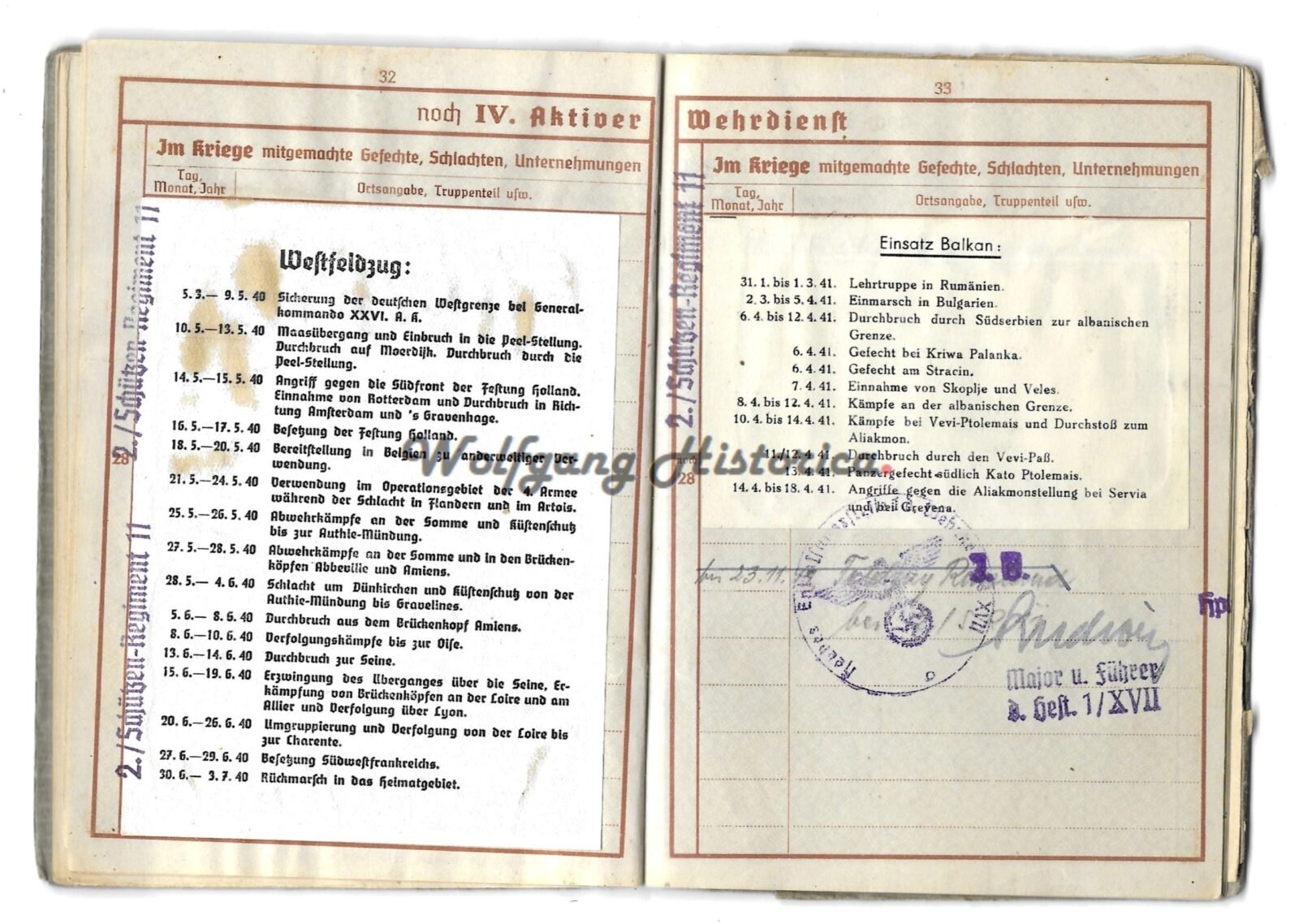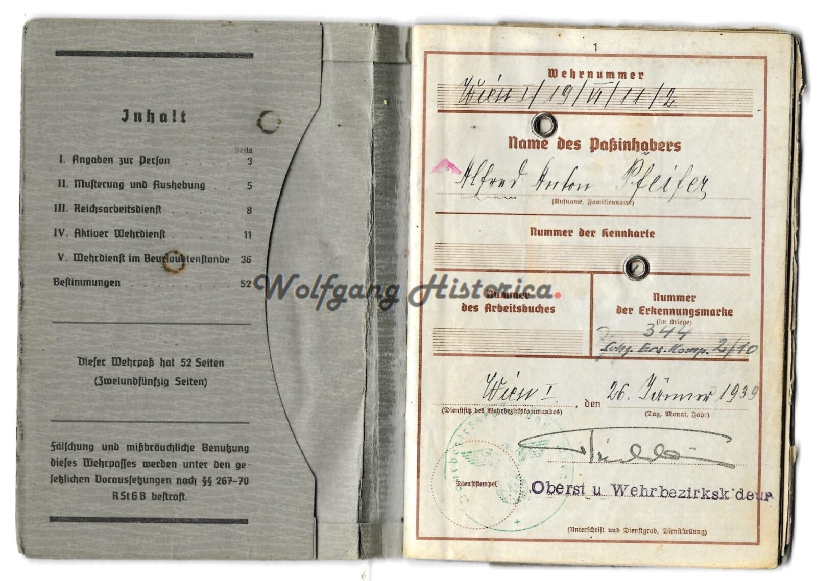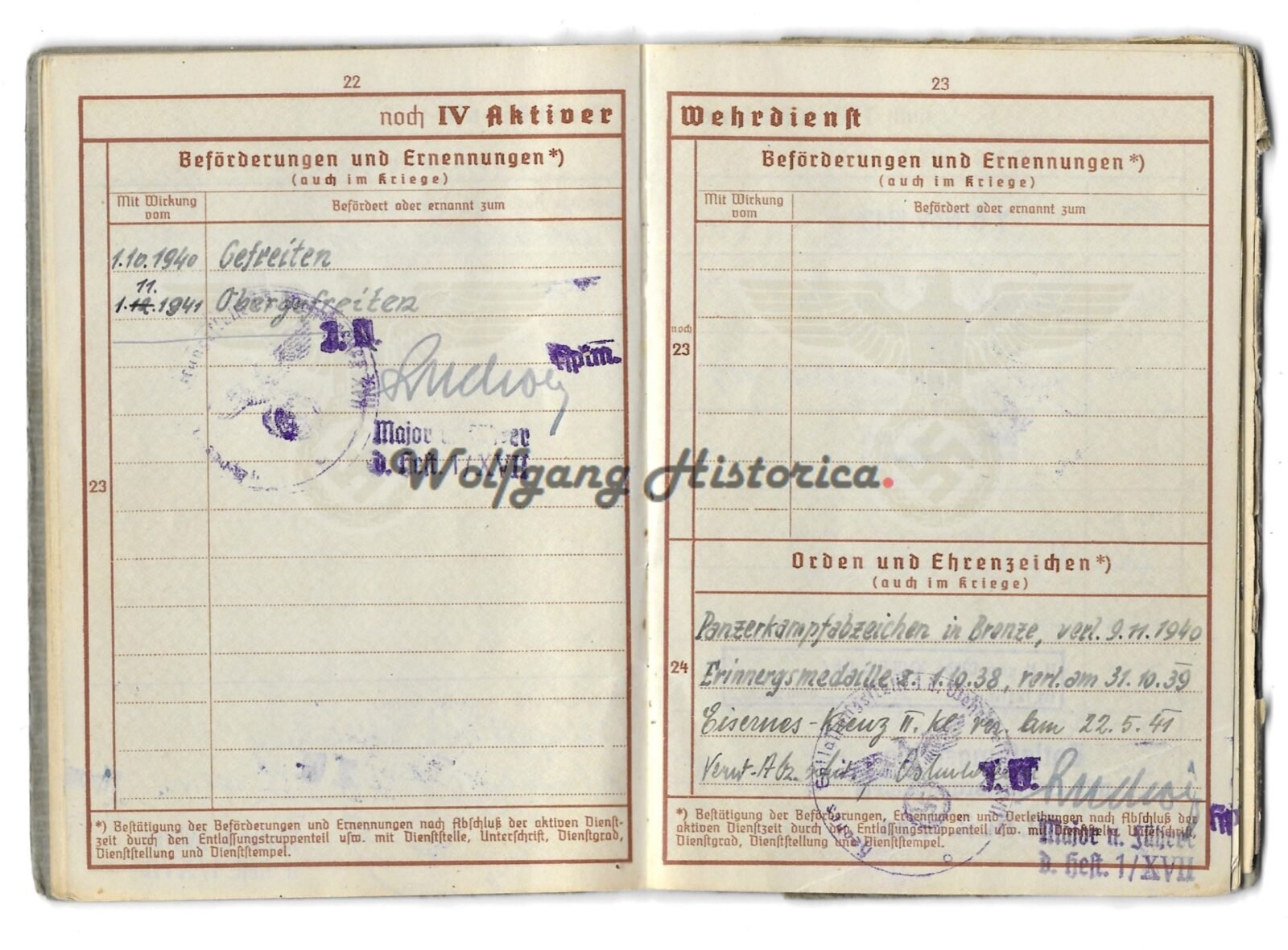 Original Wehrpass of Obergefreiter Alfred Pfeifer, who served with Kavallerie-Schützen-Regiment 11 (later Schützen-Regiment 11) of the 9. Panzer-Division. During his service he was awarded with the bulgarischen Soldatenkreuz für Tapferkeit 2. Klasse, Panzerkampfabzeichen in Bronze (1940!),Erinnerungsmedaille an den 01.10.1938, Eisernes Kreuz 2. Klasse, Verwundetenabzeichen in Schwarz & Winterschlacht im Osten 1941/42. He took part in the campaigns against the Netherlands, Belgium, France, Balkan and Russia. He was discharged from the Wehrmacht after being seriously wounded by a Lungendurchschuß. He died in 1976.