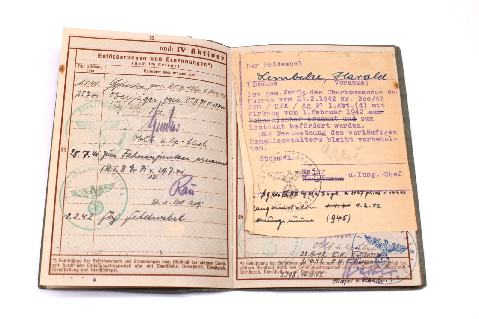 Original Wehrpass of Oberleutnant Harald Lemcke, born on January 1, 1923 in Freiburg (Breisgau). Wehrpass opened on May 17, 1940. He wore the Erkennungsmarke: -343- 6 (s.mot.) Art.Ers.Rgt.112. Oberleutnant Lemcke met his fate when he was Killed in Action on October 9, 1942 due a Kopfschuss (Head shot) at 6 km. nordwestl. Gunaika, etwa 80 km. südwestlich Maikop (Nordwest-Kaukasus).
