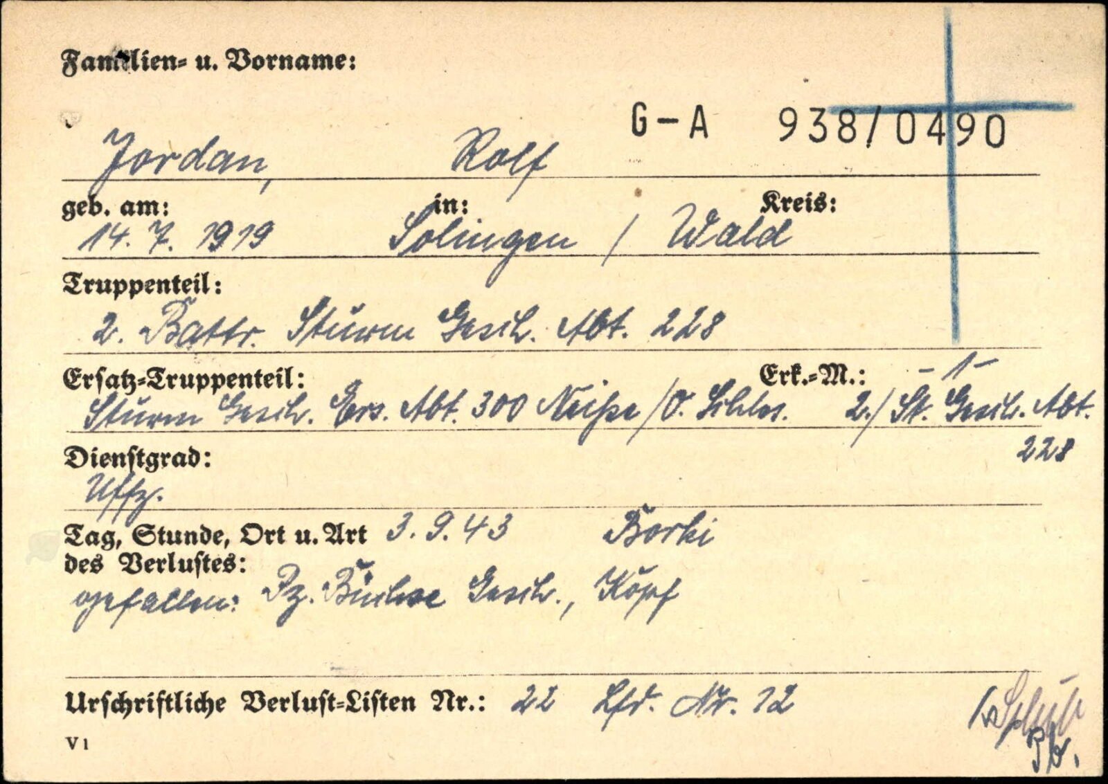 Wehrpass of Unteroffizier Rolf Jordan who served with the Regimentsstab/ Artillerie-Regiment 76 & the 2. Batterie/ Sturmgeschütz-Abteilung 228. He was Killed in Action on September 3, 1943 near Borki by a “Panzerbüchse-geschütz Kopf” (hit by Panzerbüchse in the head) and earned the Verwundetenabzeichen in Schwarz (2x entered for 20.1.42 & 25.1.43 ?), Winterschlacht im Osten 1941/42 & the Eisernes Kreuz 2. Klasse. He got wounded on December 15, 1942 during the attempt to penetrate the Stalingrad pocket. He was trained as a ‘Richtkanonier’. Good condition.
