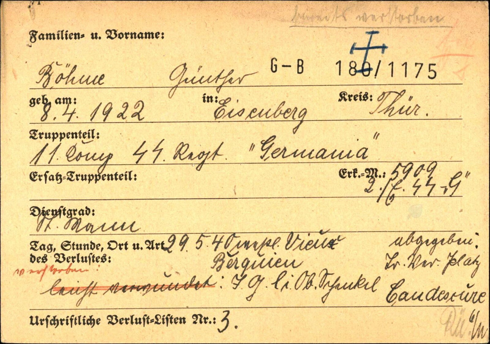 Interesting early Killed in Action Wehrpass of a soldier from the 11. Kompanie/ SS-Regiment “Germania” on the Western Front! On May 29, 1940 he was (seriously) wounded near Vieux-Berquin (France) and died on June 6, 1940 at Neufchateau (Luxembourg). Scarce Wehrpass of early Waffen-SS casualty, who signed up for the SS-Standarte “Germania” at Hamburg-Langenhorn in 1939. He earned the HJ-Leistungsabzeichen, Grundschein der DRLG and also had a Reiterschein. I added his casualty card from the archives per illustration. He lies buried in Lommel: Block 2 Grab 321.