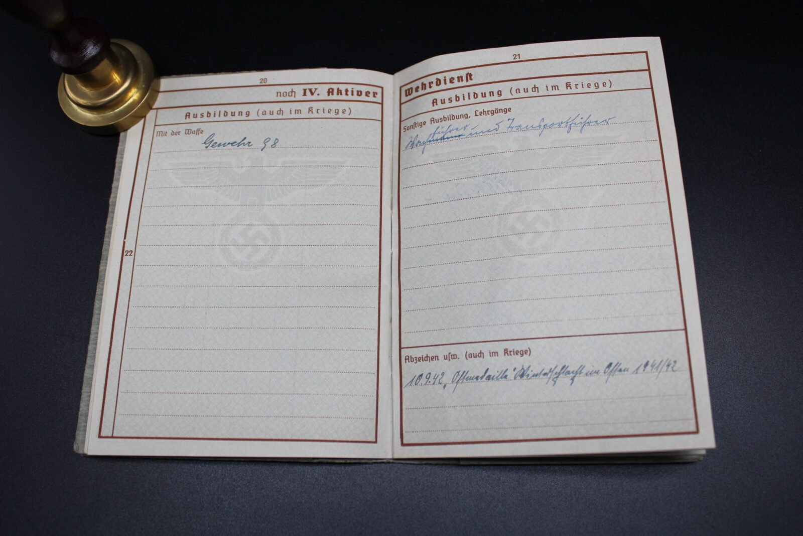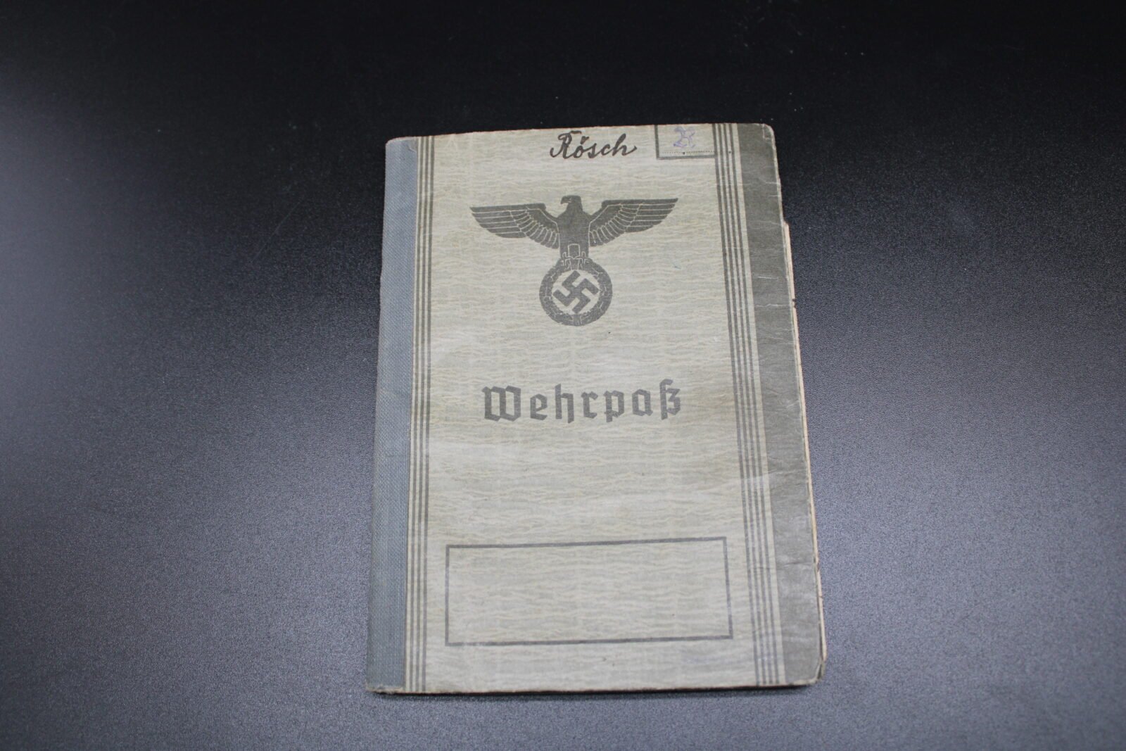 Original Wehrpass of Feldwebel Rösch, who served (most interestingly) with the Baukolonne 159 and Zugwachabteilung z.b.V. 501. During his service, he earned the Winterschlacht im Osten 1941/42 (Winter War Medal) and Kriegsverdienstkreuz 2. Klasse mit Schwertern (War Merit Cross 2nd Class with Swords). Condition as seen.