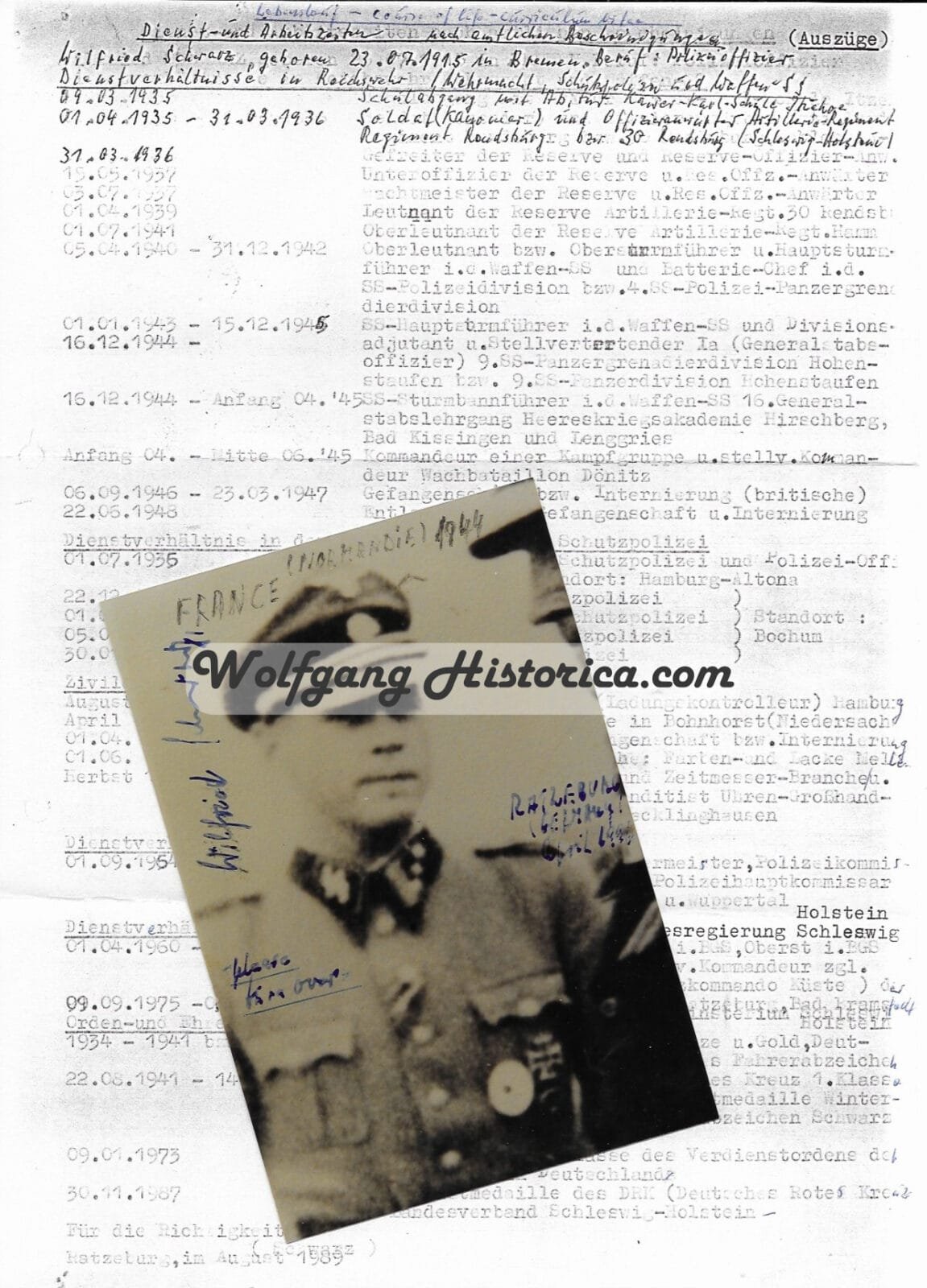 Postwar Signature of Wilfried Schwarz, Veteran and Officer of the Stab/ 9. SS-Panzer-Division “Hohenstaufen”, where he earned the German Cross in Gold! Interesting figure, as he was Ic Staff Officer during Operation Market Garden! Comes with an extra letter containing his military service.