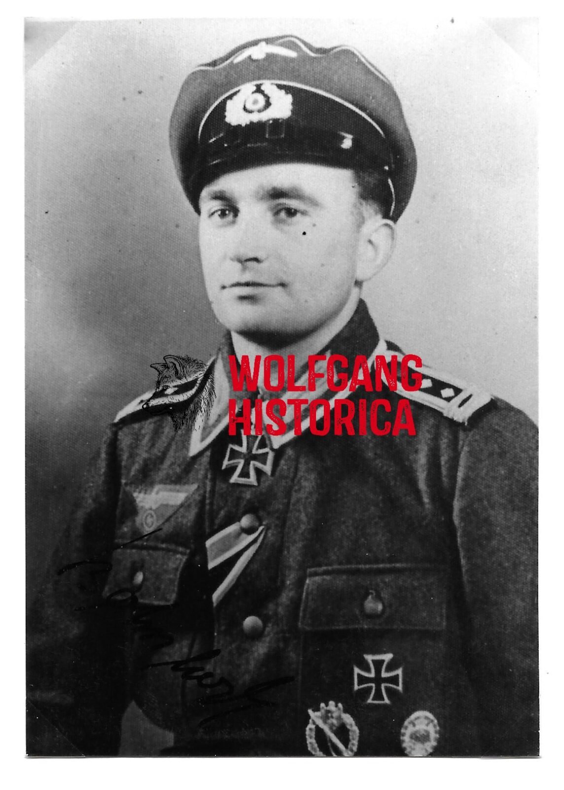Original Postwar Signature on a Postwar Photo of Wilhelm Berkenbusch. Fahnenjunker-Oberfeldwebel Wilhelm Berkenbusch (26.06.1918 † 23.10.2002) earned the Ritterkreuz on January 15, 1945 as Oberfeldwebel und Zugführer in the I. Bataillon/ Grenadier-Regiment 914 of the 352. Volksgrenadier-Division.