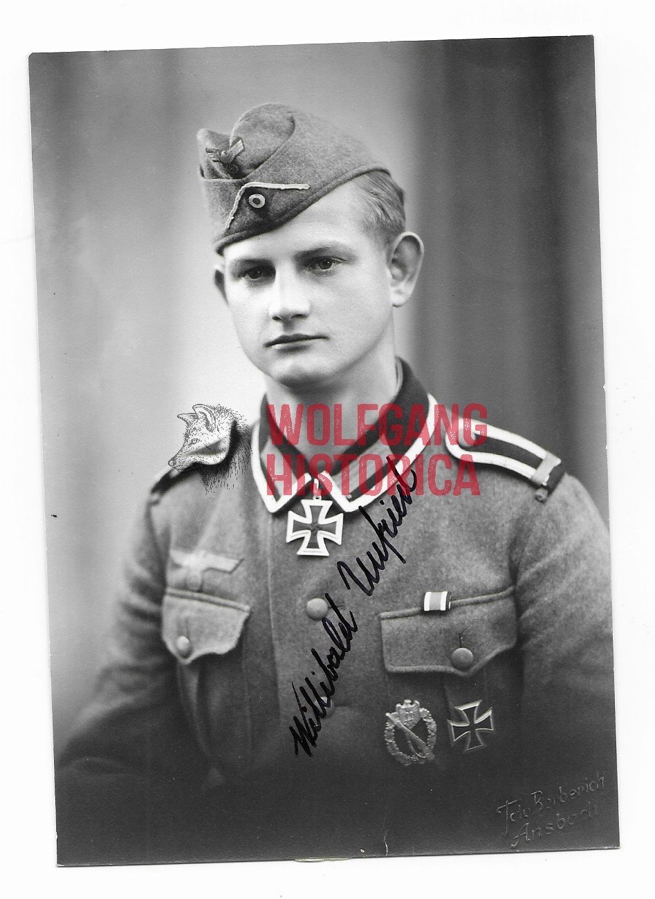 Original Wartime Studioportrait with a Postwar Signature of Willibald Unfried. Gefreiter Willibald Unfried (26.06.1919 †21.07.1994) earned the Ritterkreuz on March 4, 1942 as Gefreiter und MG-Schütze 1 in the 9. Kompanie/ Grenadier-Regiment 213 of the 73. Infanterie-Division. Good condition. Postcardsize.